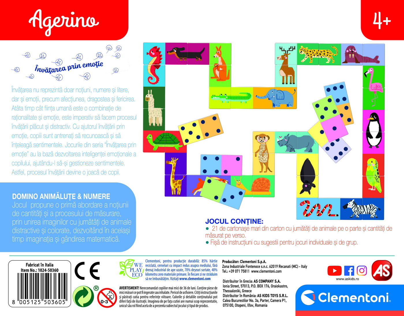 Agerino Domino Animăluțe & Numere transformă învățarea într-o aventură veselă, unde fiecare piesă ascunde o lecție nouă. Inspirat din conceptul Învățare prin emoție, jocul stimulează inteligența emoțională și curiozitatea naturală a copiilor.