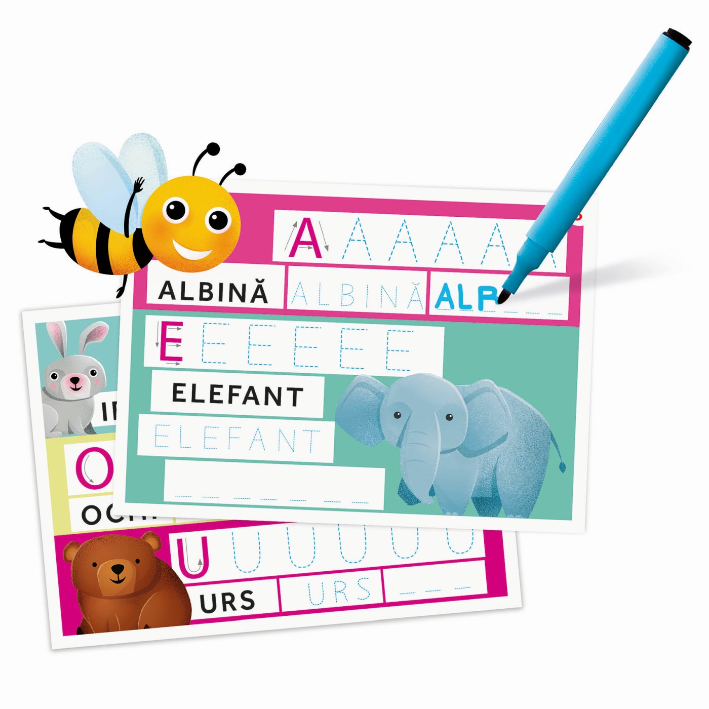 Invat sa scriu este un joc educativ progresiv special conceput pentru copiii de la 5 ani. Cartonasele colorate pentru scris incurajeaza copilul sa invete sa scrie si sa citeasca. Pornind de la exercitii simple de pre-instruire, copilul invata sa uneasca obiectele si literele, sa practice si sa scrie primele cuvinte. Mai mult, cu markerul special si a buretelul, copilul poate repeta exercitiile de nenumarate ori. Setul contine 8 planse ilustrate, 1 marker, 1 buretel. Valori dezvoltate aptitudinile motorii, logica, citirea si scrierea, autonomia, memoria si fantezia, invatarea numerelor si calculelor. Toate jocurile lui Agerino au fost concepute de specialisti in pedagogie si psihologie si au fost testate in scoli. Varsta recomandata 5+.