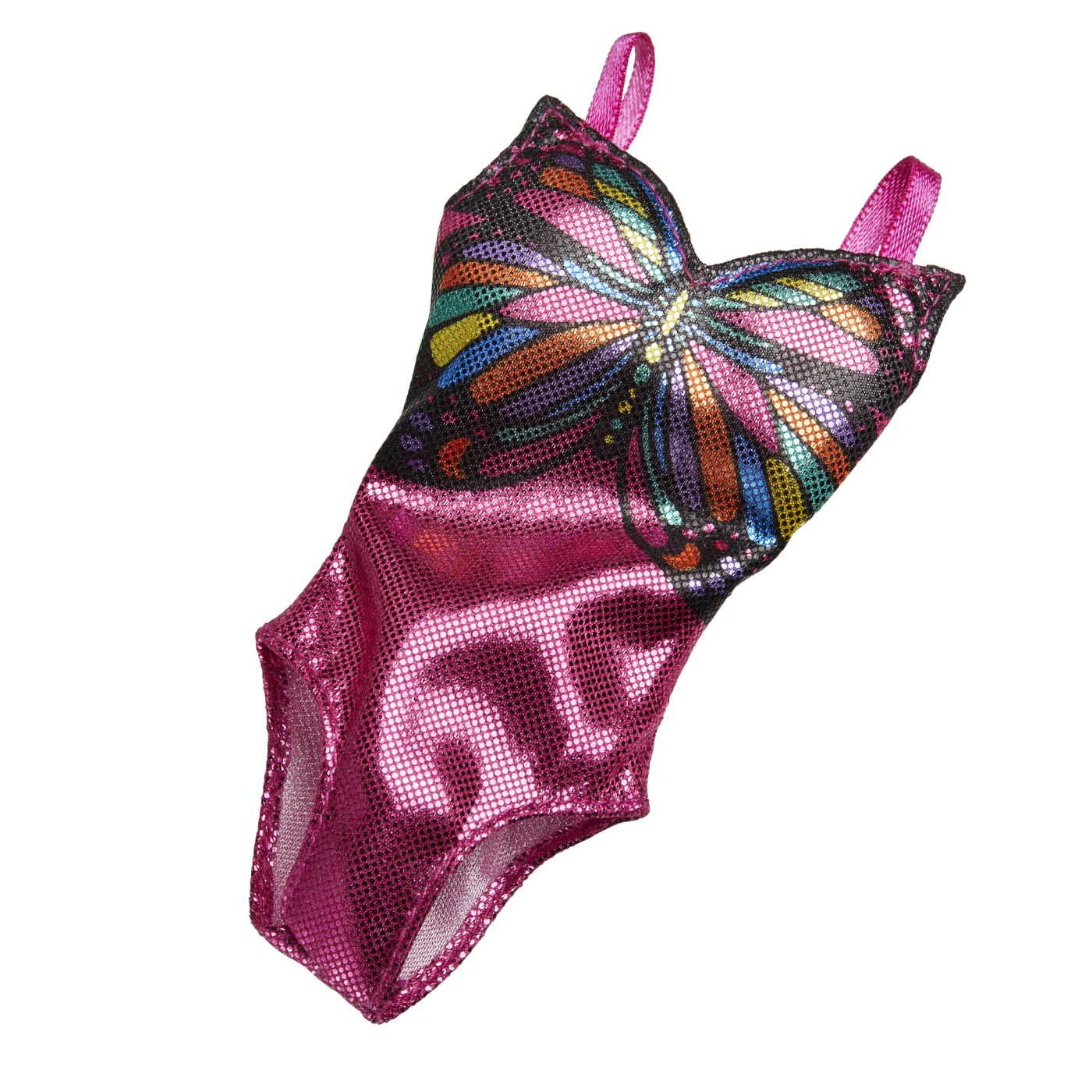 Gata de calatorie cu masina sau avionul.O valiza draguta, castile, o masca de fata si un accesoriu pentru smartphone sunt elementele esentiale perfecte pentru calatorie.Papusa Barbie este gata in costumul ei de baie stralucitor cu tematica fluture, palaria de soare, papucii elegante, ochelarii de soare si lotiunea de soare.