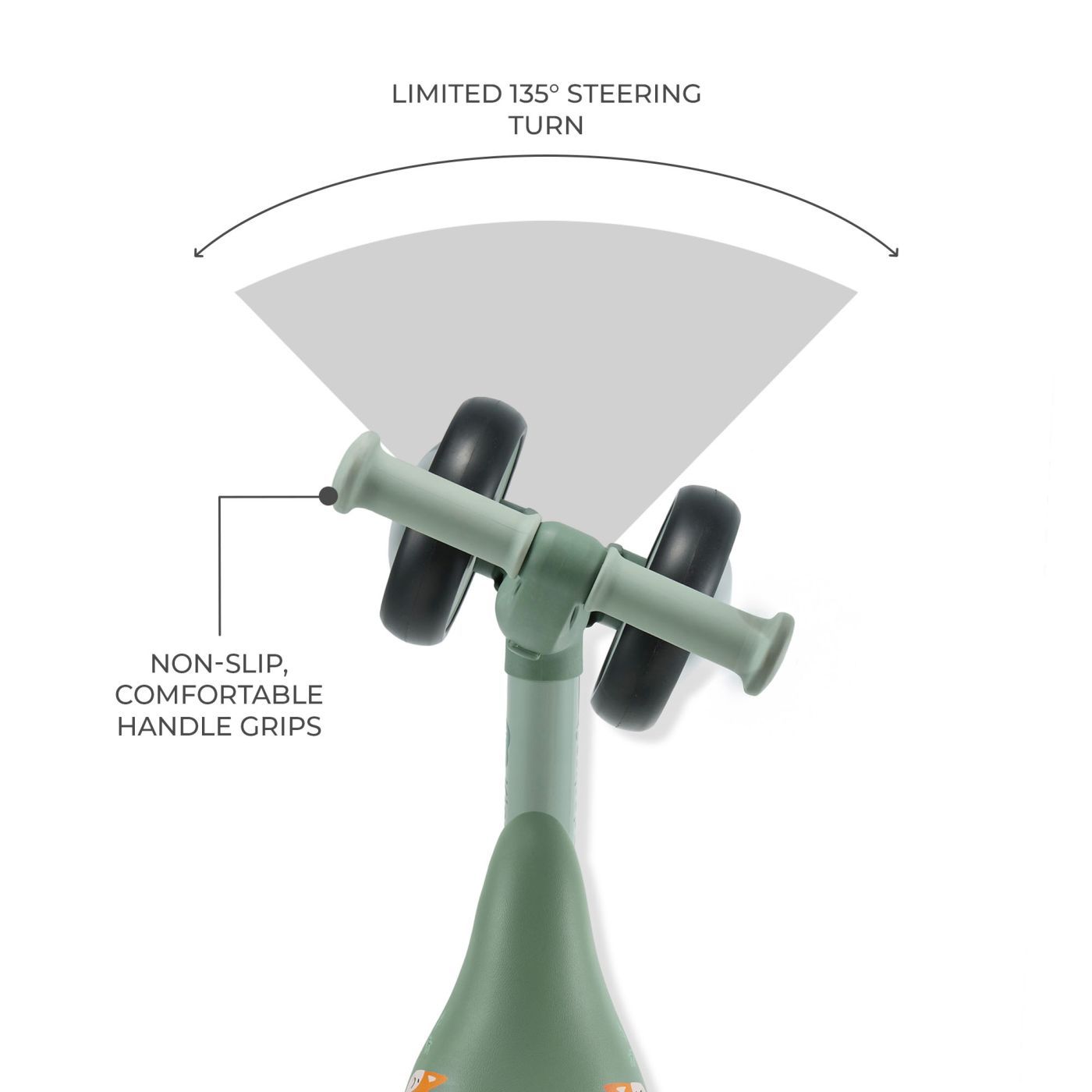 Limitatorul de viraj al ghidonului (135°) previne manevrele bruște, ajutând copilul să învețe mersul pe bicicletă într-un mod sigur și controlat.