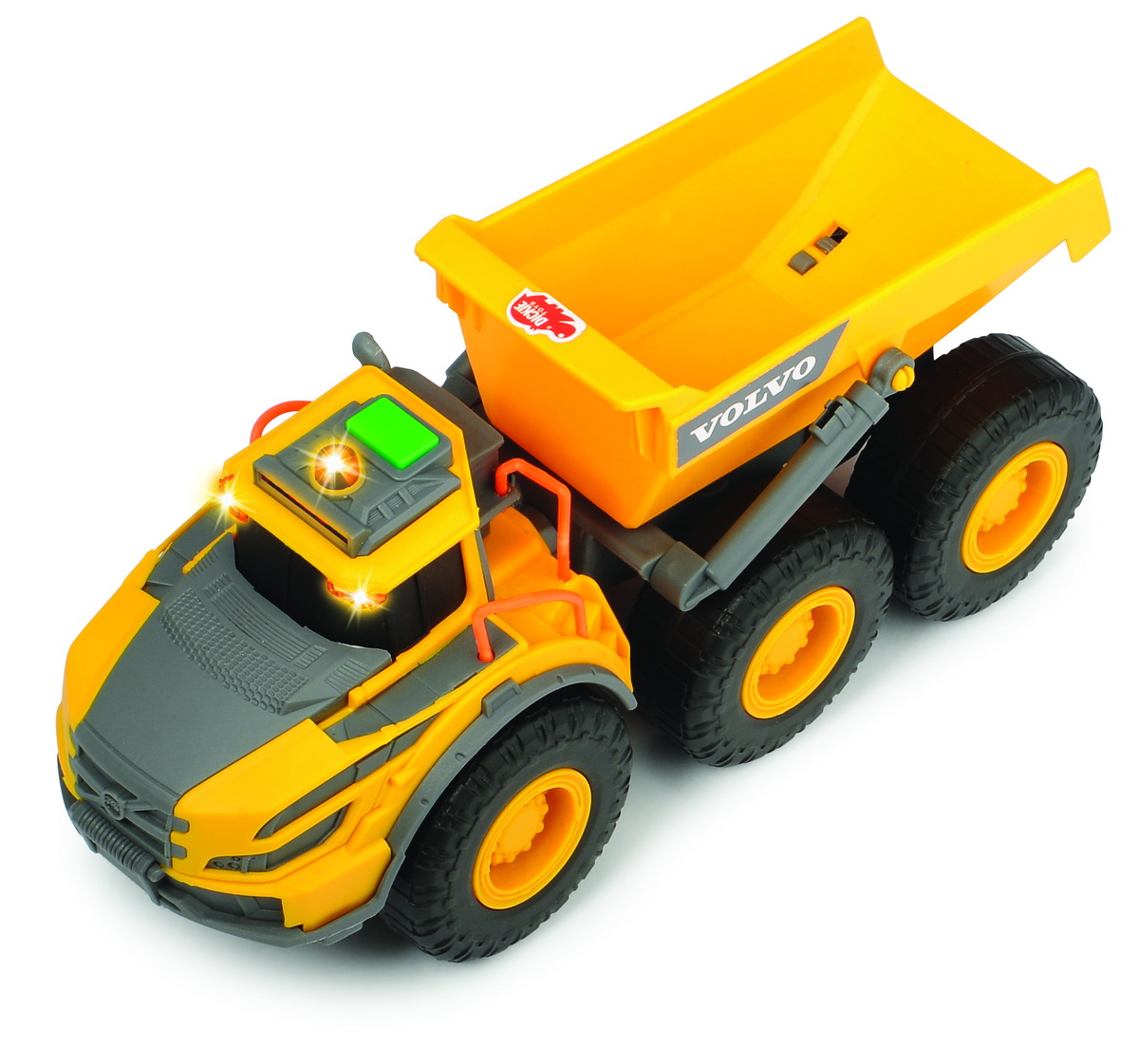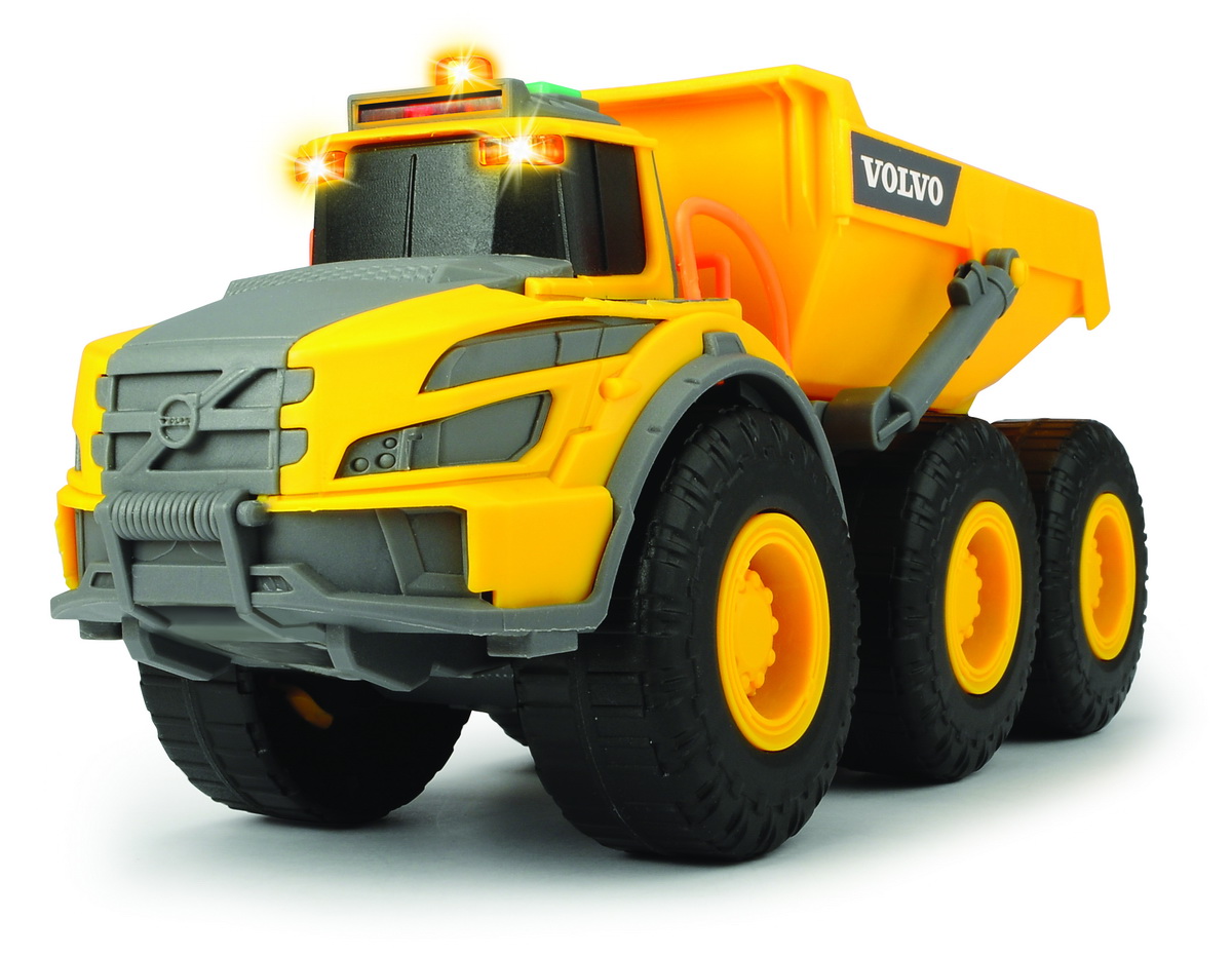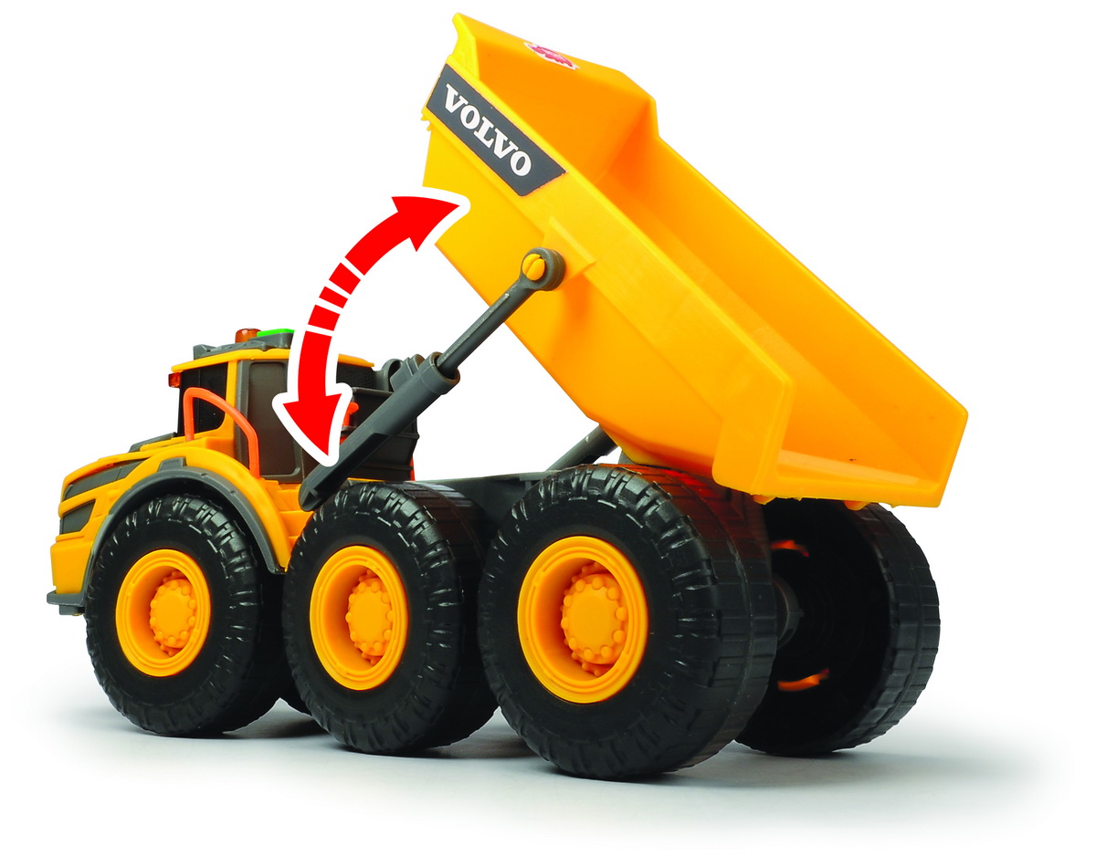Camion basculant Volvo Articulated Hauler de la Dickie Toys le permite copiilor sa-si recreeze viata pe un santier la scara larga. Remorca camionului poate fi ridicata l Efectele luminoase si sonore ofera o experienta de joc variata. Dimensiunea aproximativa a camionului este de 23cm.