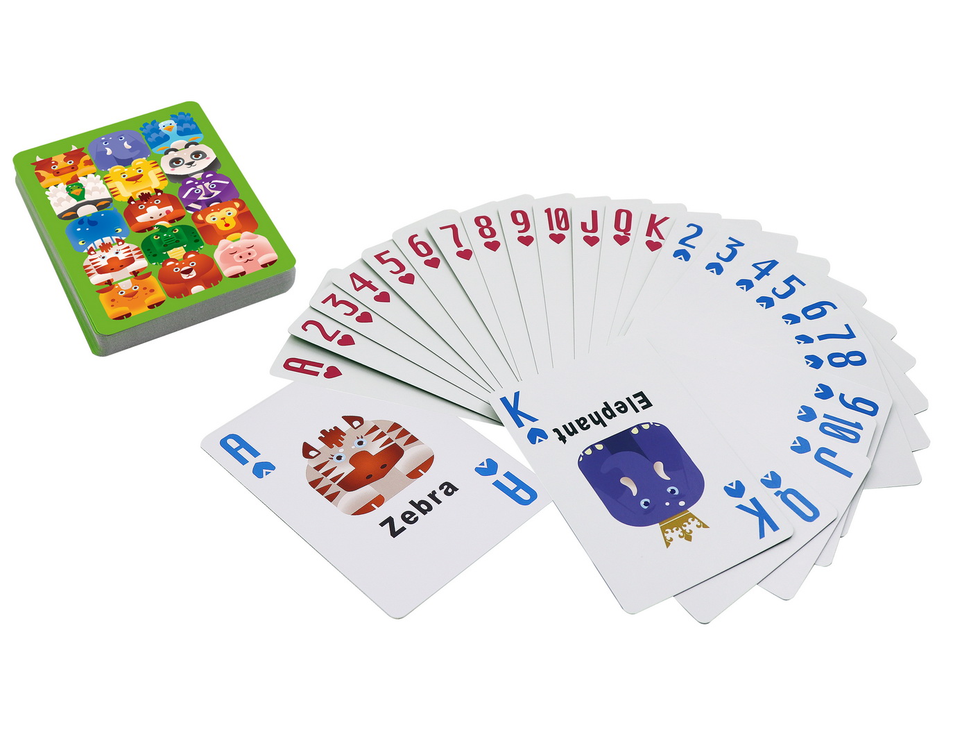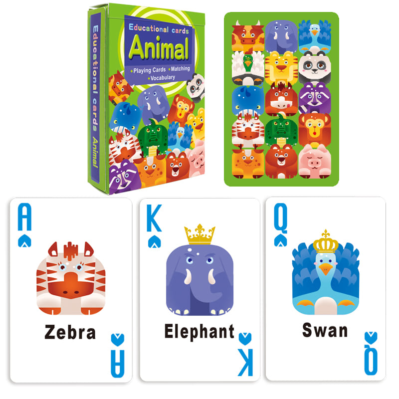 Carti de joc pentru copii, cu animale in limba engleza. In pachet veti gasi 54 de carti de dimensiunea 58x88mm. Inainte de aparitia internetului, jocurile de carti erau unul dintre cele mai populare moduri de petrecere a timpului liber. Cartile de joc sunt usor de transportat, incap intr-un buzunar si au ramas un mod agreabil de divertisment. Fie ca e vorba de jocuri de carti simple, de ghicit in carti sau de pasiente solitare, cartile de joc sunt iubite si folosite pe intreg mapamondul.