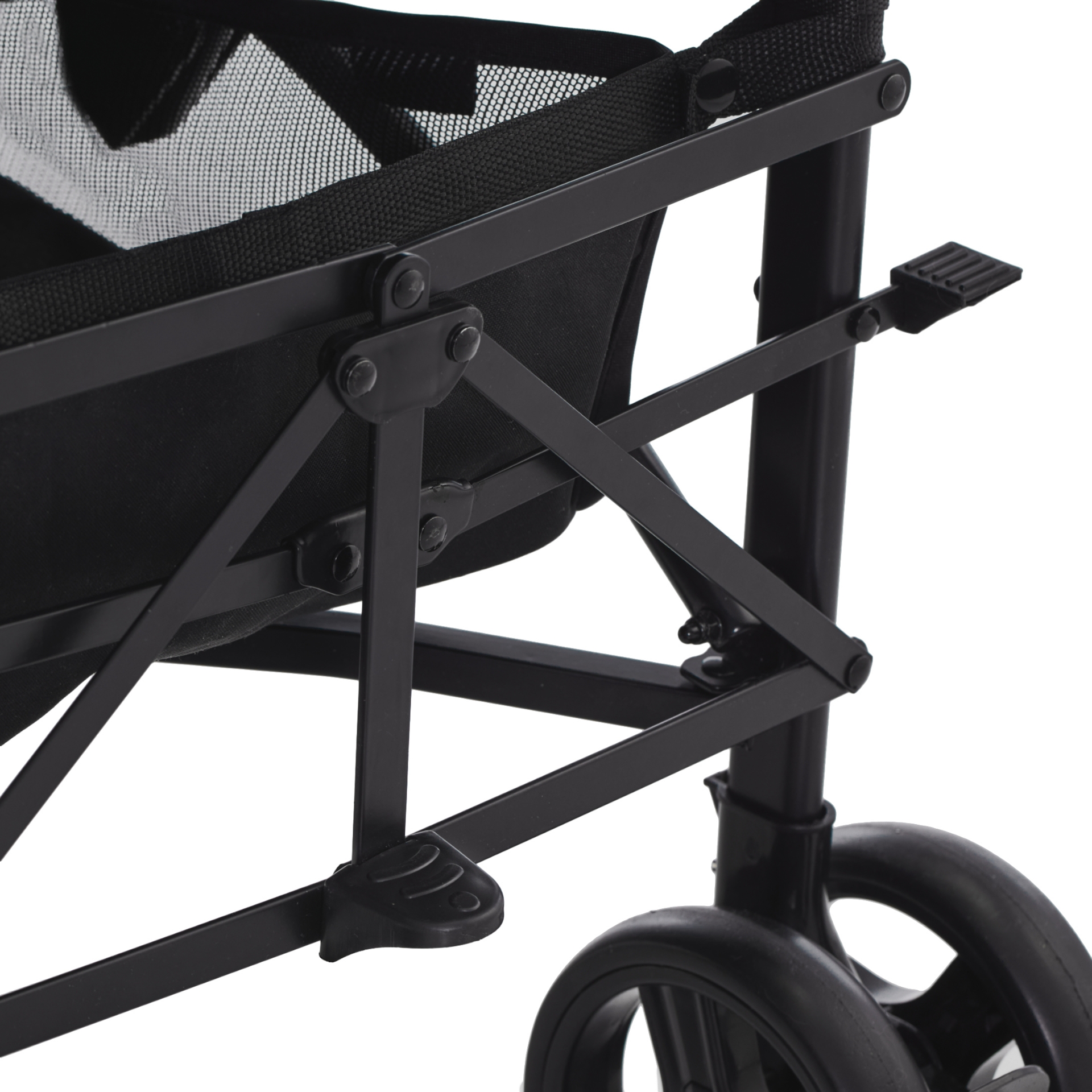🛞 Roțile ușoare din spumă EVA nu necesită pompare și sunt rezistente la înțepături. Dispun de sistem de amortizare și pot fi blocate în față pentru un control mai bun pe suprafețe denivelate. În spate, cele două frâne te ajută să oprești căruciorul în siguranță, chiar și cu o singură frână activată.
