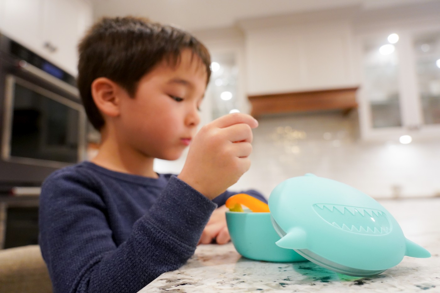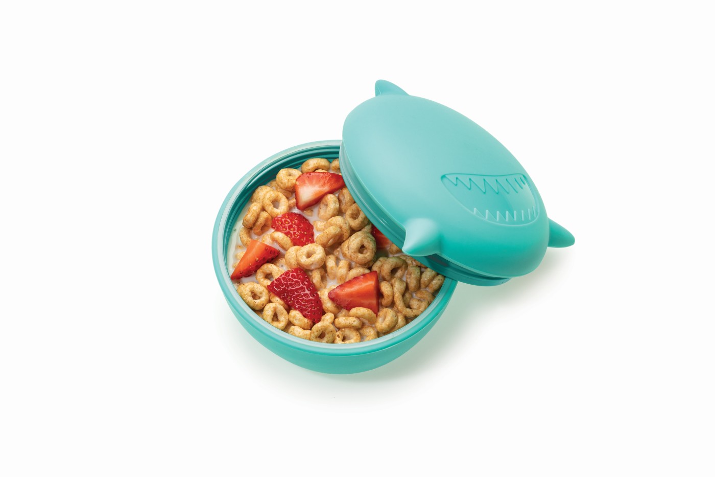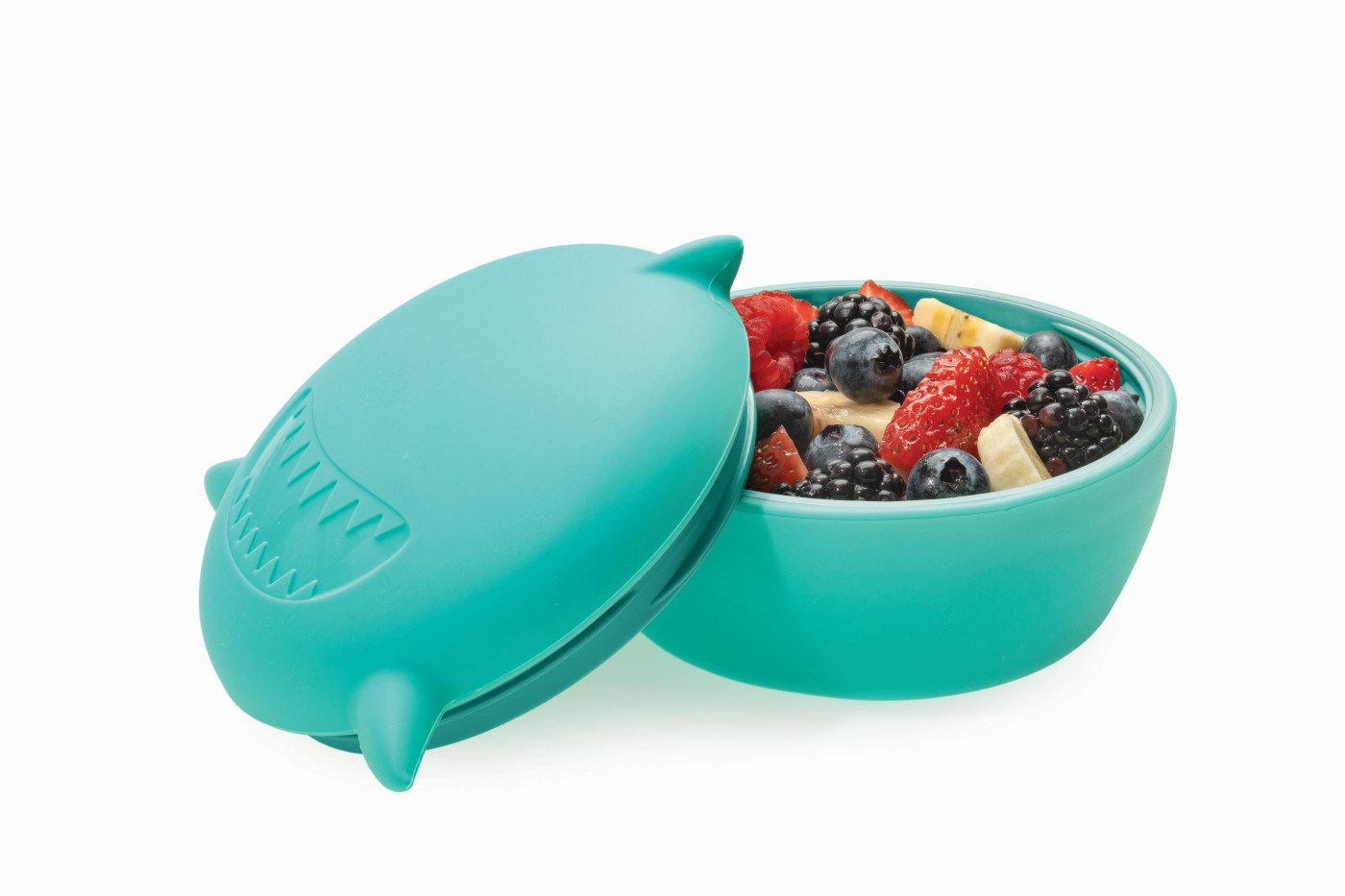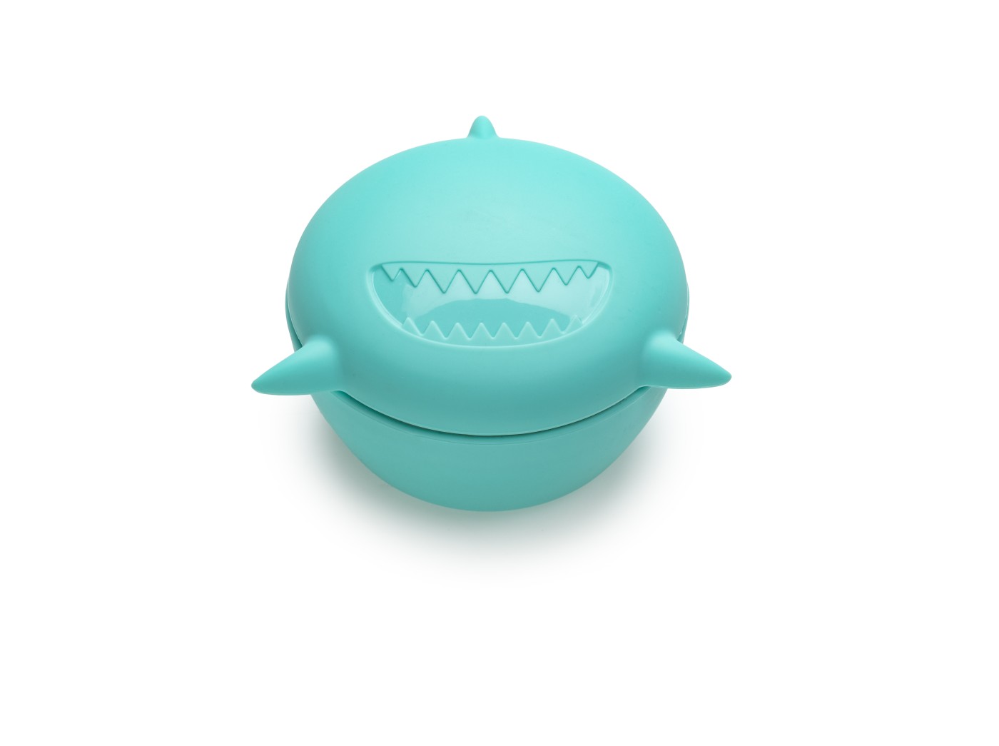 Un bol din silicon în formă de rechin, cu capac etanș și design prietenos – ideal pentru gustări sănătoase și mese distractive pentru cei mici.