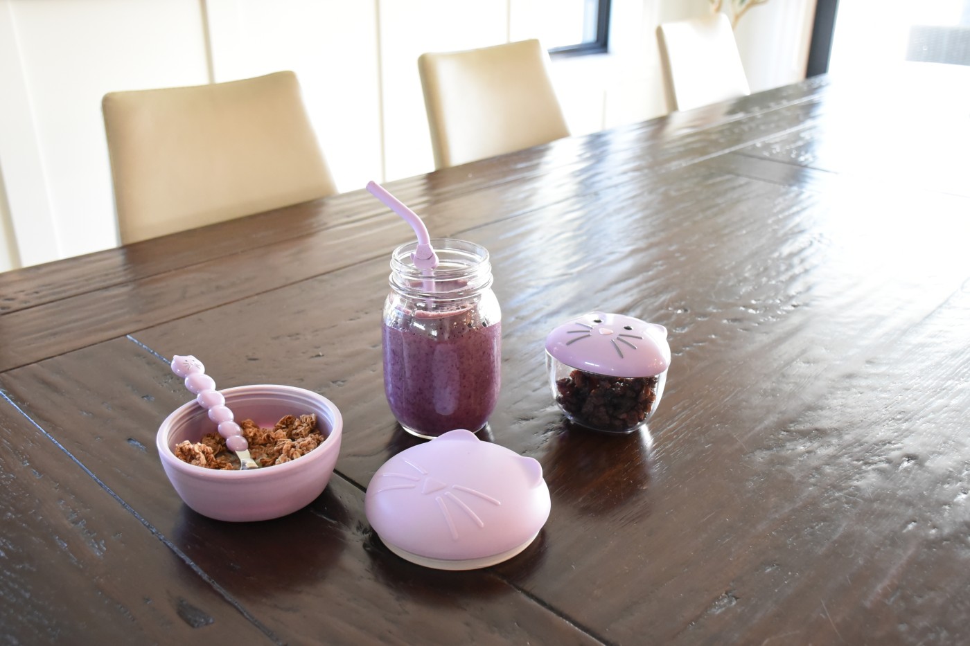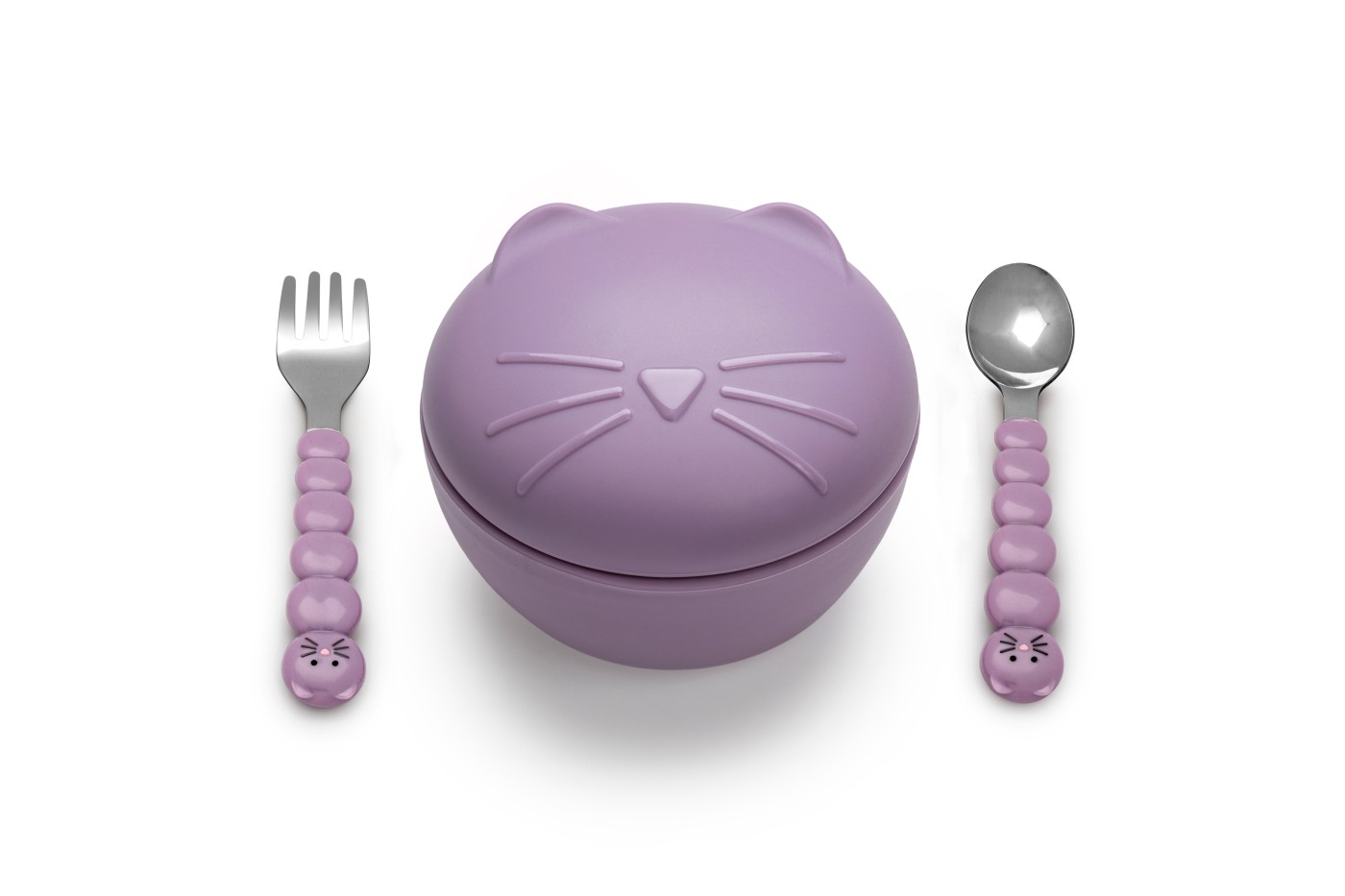 Un bol adorabil cu urechiușe de pisică, capac etanș și tacâmuri incluse – tot ce are nevoie bebelușul tău pentru gustări delicioase acasă sau în deplasare!