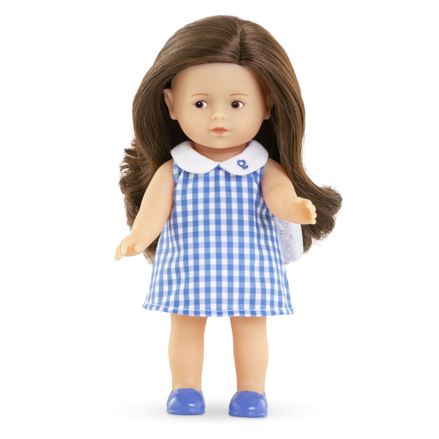 Mini Corolline Romy este o papusa mica, cu pielea deschisa la culoare, de 20 cm, &bdquogata de oferit cadou&rdquo. Are un corp moale la atingere, complet din vinil, cu un parfum delicat de vanilie. Ochii ei caprui sunt pictati pe fata, iar parul lung, matasos si saten este ideal pentru coafare usoara. Vine imbracata intr-o rochie in carouri si o pereche de pantofi mulati asortati.