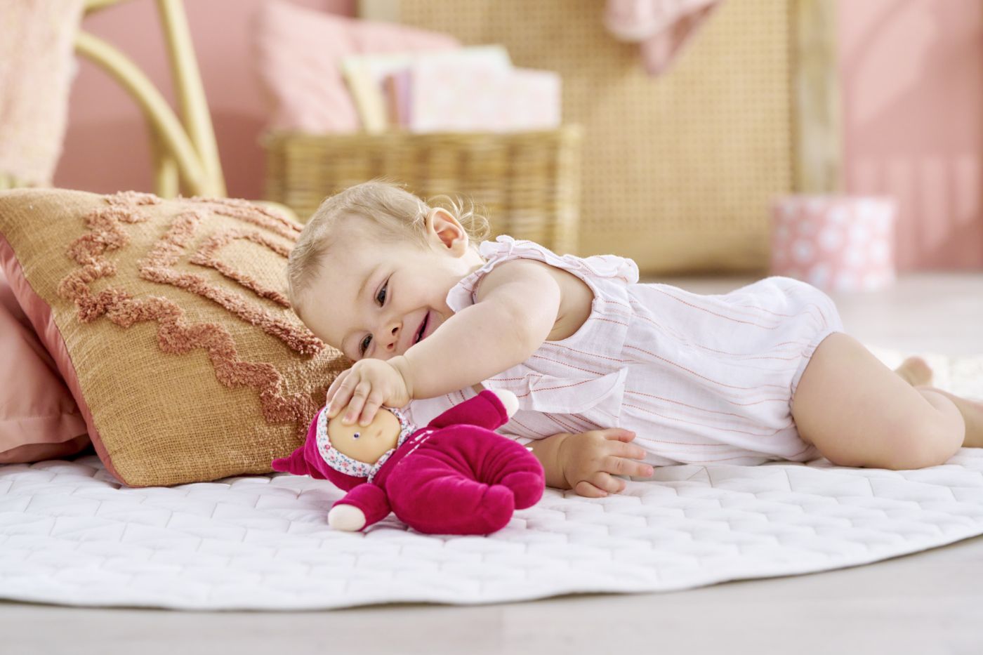 Prima papusa de joaca si prietena, papusa de plus de 20 cm este potrivita pentru copii inca din primele luni de viata si este fabricata dintr-un material foarte moale. De asemenea, are un clopotel in interior pentru a intari perceptia auditiva. Papusa este extra moale si, prin urmare, perfecta pentru a fi alintata, cuibarita si imbratisata. Parfum de vanilie caracteristic, toate papusile Corolle au un parfum placut si delicat de vanilie. De asemenea, pe papusa este cusuta o eticheta pentru inregistrarea numelui si adresei papusii in cazul in care se pierde. Se poate spala la masina, papusa poate fi spalata la masina la ciclu delicat.