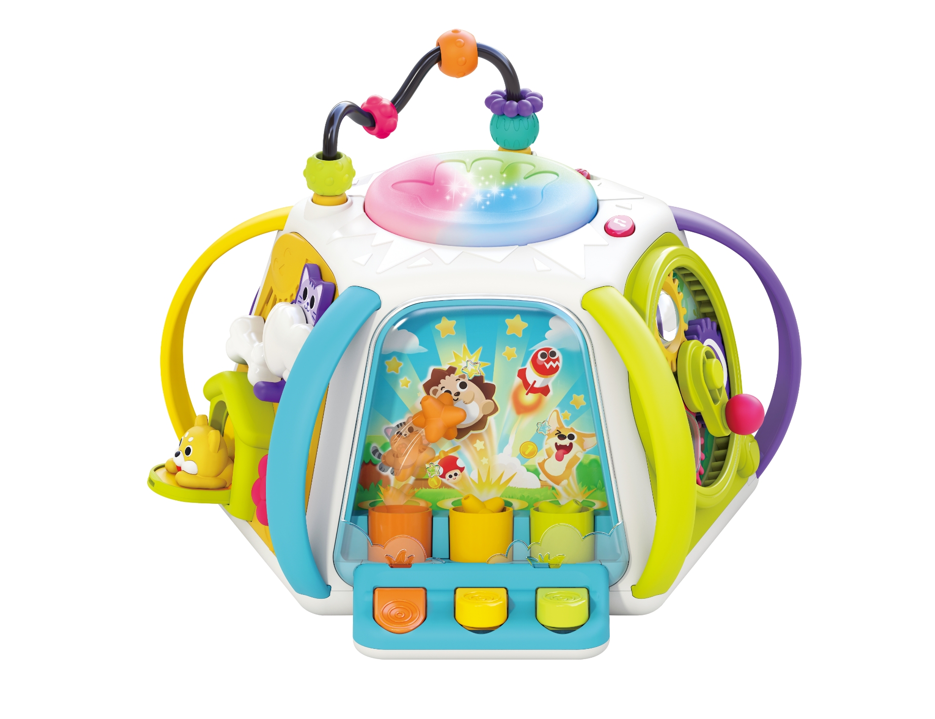 Cubul include activități variate precum roți care se învârt, forme de potrivit, clapete, butoane, elemente muzicale și imagini colorate—totul pentru a menține interesul copilului și a-i susține dezvoltarea pas cu pas.