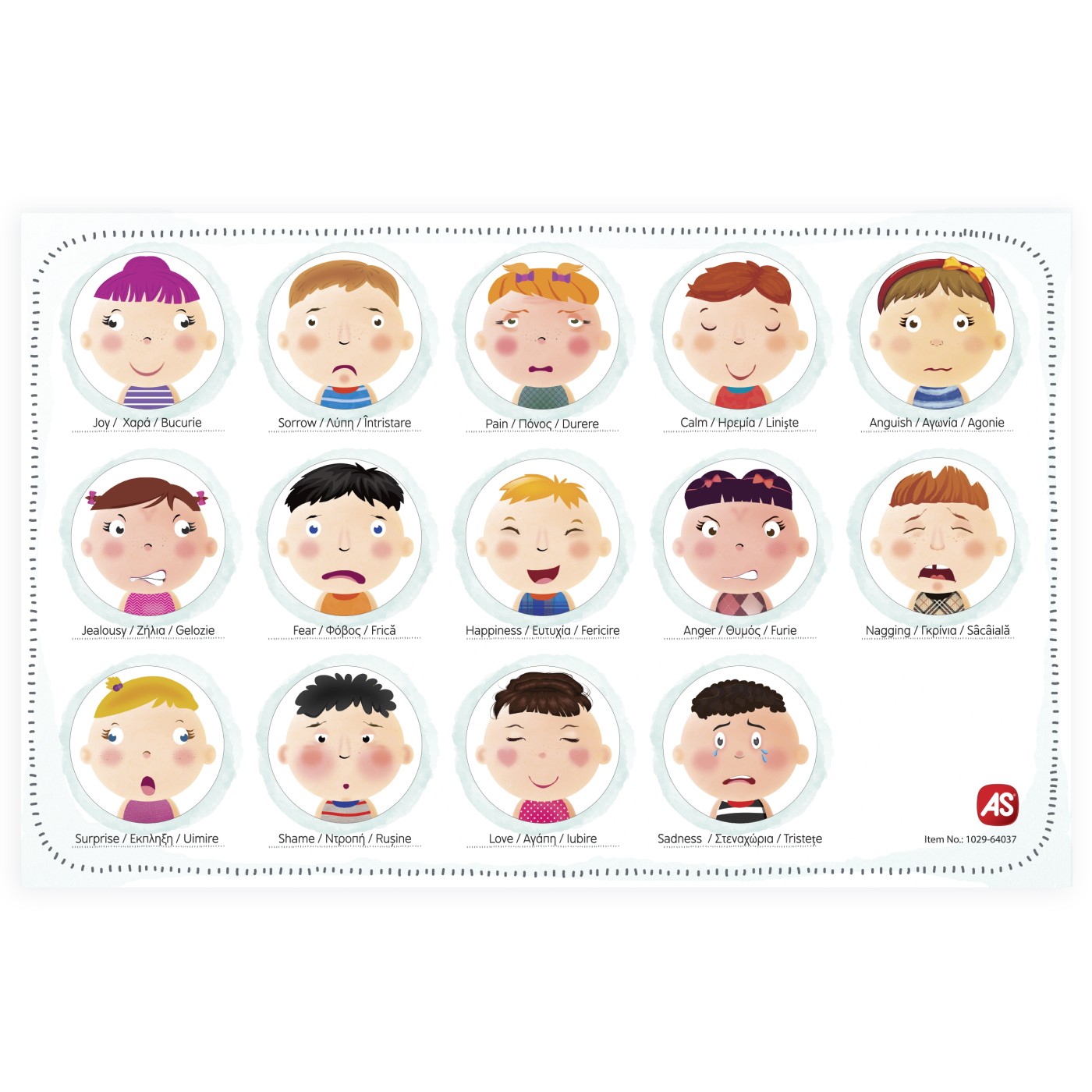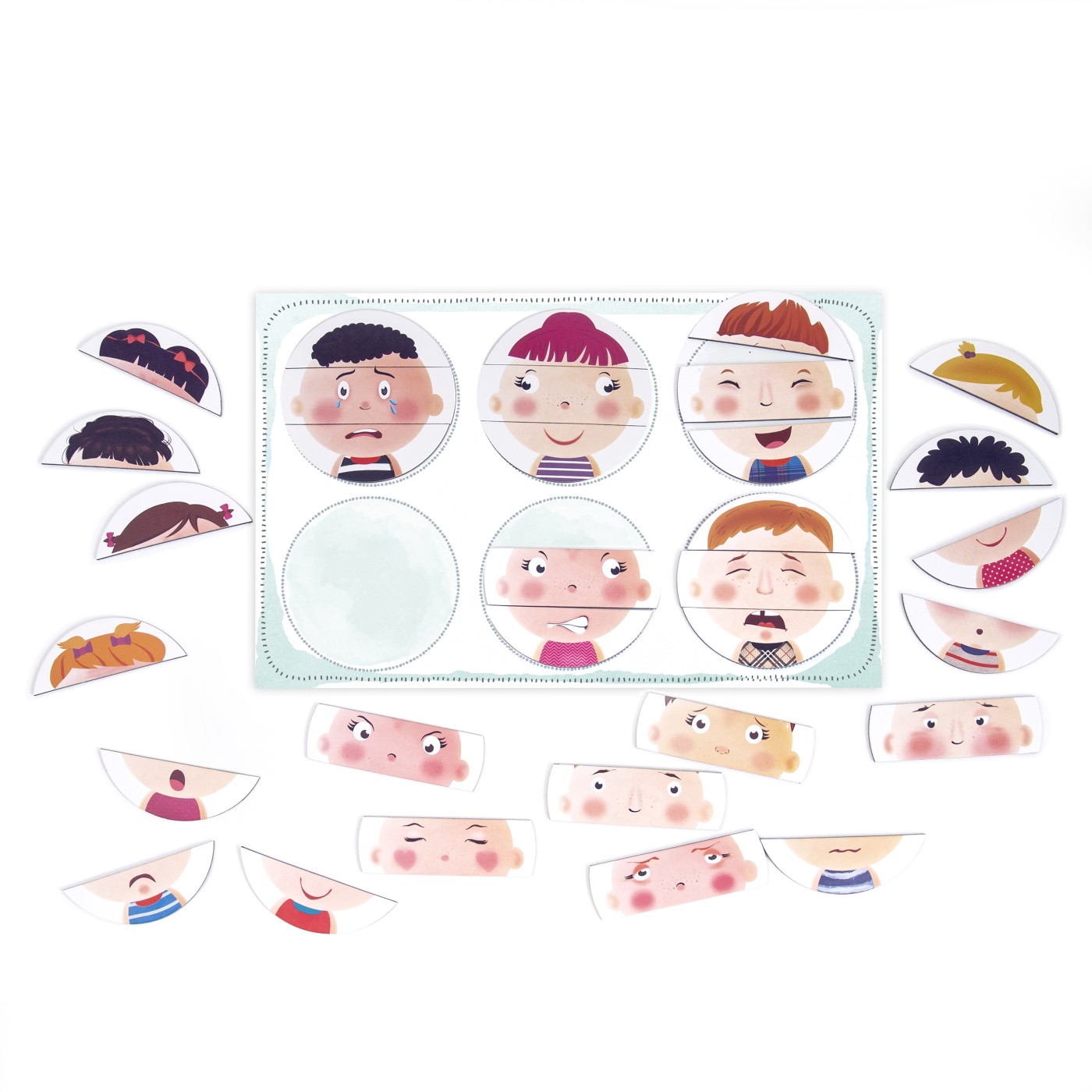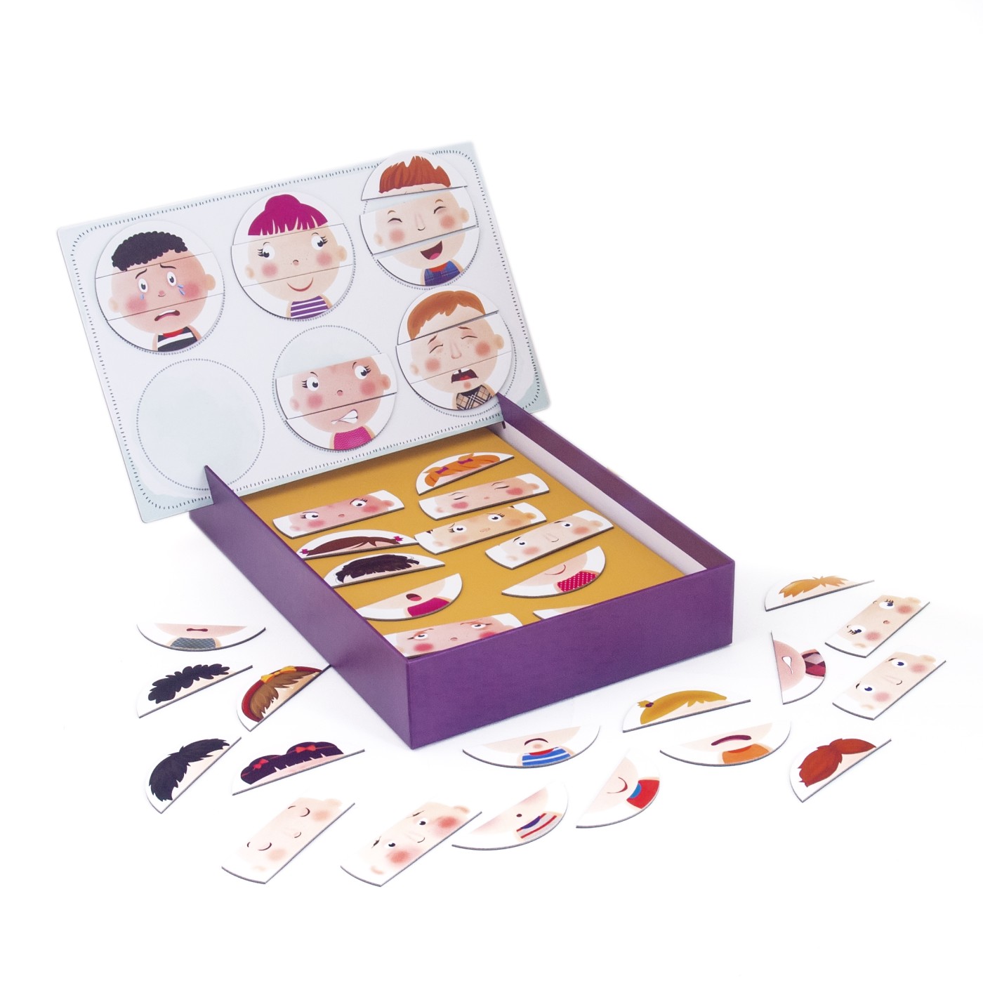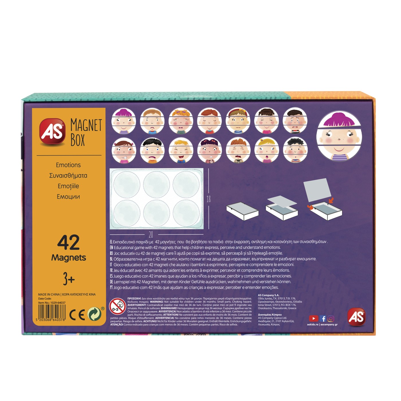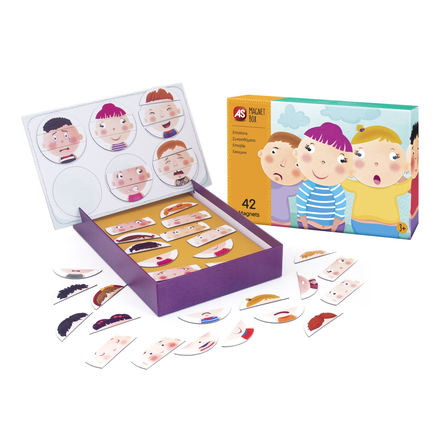 Un joc educational de invatare emotionala cu 42 de magneti de carton. Setul ii familiarizeaza pe copii cu invatarea emotionala, ajutandu-i sa recunoasca mai intai diferitele expresii faciale si apoi, cu ajutorul ghidului ilustrat, sa invete cum se reflecta diferitele emotii umane in expresiile lui.Fiecare magnet descrie diferite caracteristici pentru a reflecta diferite expresii si emotii. Cum arata cineva cand este fericit, trist, furios? Cum se reflecta sentimentul de gelozie, rusine, dragoste asupra unei persoane?Continut 42 de magneti de carton, tabla magnetica, 1 foaie de hartie pentru invatarea emotiilor. Varsta recomandata 3 ani+.
