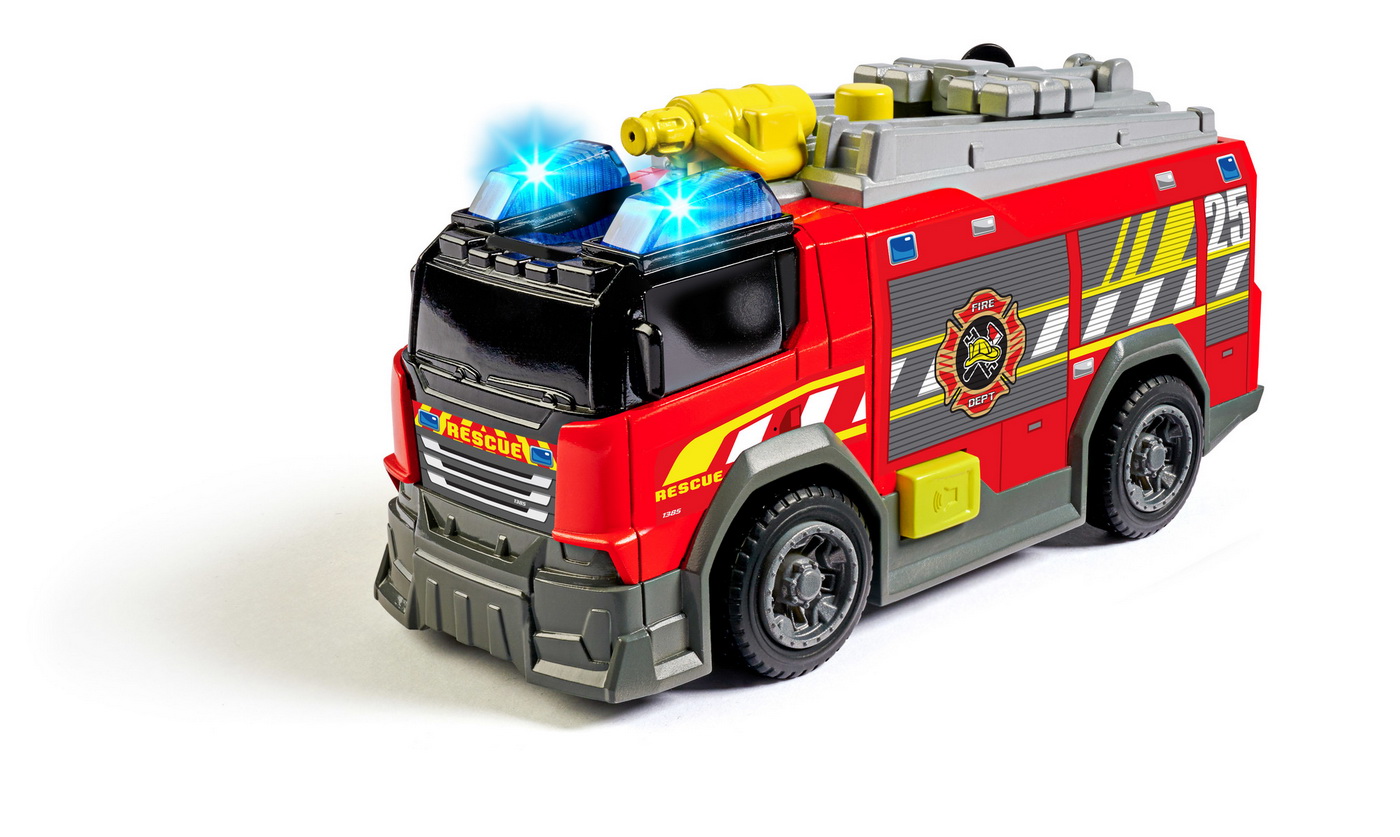 Un camion de pompieri în miniatură, cu funcție de stropire, lumini, sunete și roți mobile. Ideal pentru joaca de-a salvatorii curajoși, acasă sau în parc!