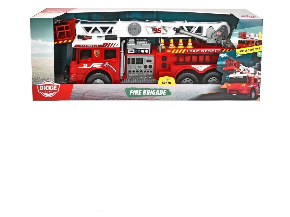 Masina de pompieri Dickie Toys, cu o lungime impresionanta de 62 cm, transforma joaca intr-o adevarata misiune de salvare. Copiii pot deveni pompieri curajosi, pregatiti sa intervina cu efecte luminoase si sonore realiste, care anunta sosirea ajutorului. Atractia principala este functia de pulverizare cu jet de apa prin stropitorul mobil, ce adauga un plus de realism si distractie. In plus, setul include accesorii precum stingatoare si piloni, pentru operatiuni de salvare si scenarii interactive. Realizata cu atentie la detalii, masina reda fidel designul unui vehicul real de pompieri. Functioneaza cu 2 baterii R6/AA de 1,5 V (incluse) si este recomandata copiilor de la 3 ani in sus.