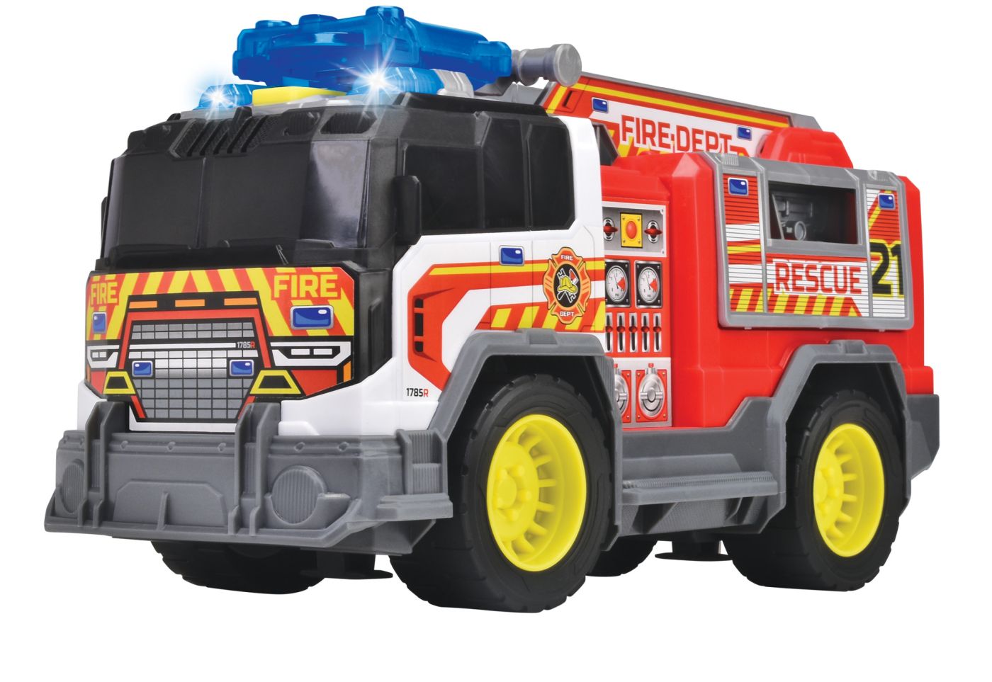 Vehiculul este dotat cu un tragător de discuri, iar copiii îl pot folosi pentru a lansa cele două discuri incluse, simulând intervenții reale de stingere a focului sau operațiuni de salvare cu apă și spumă.