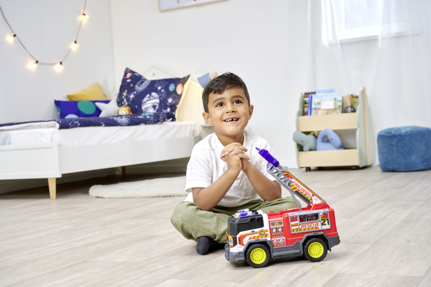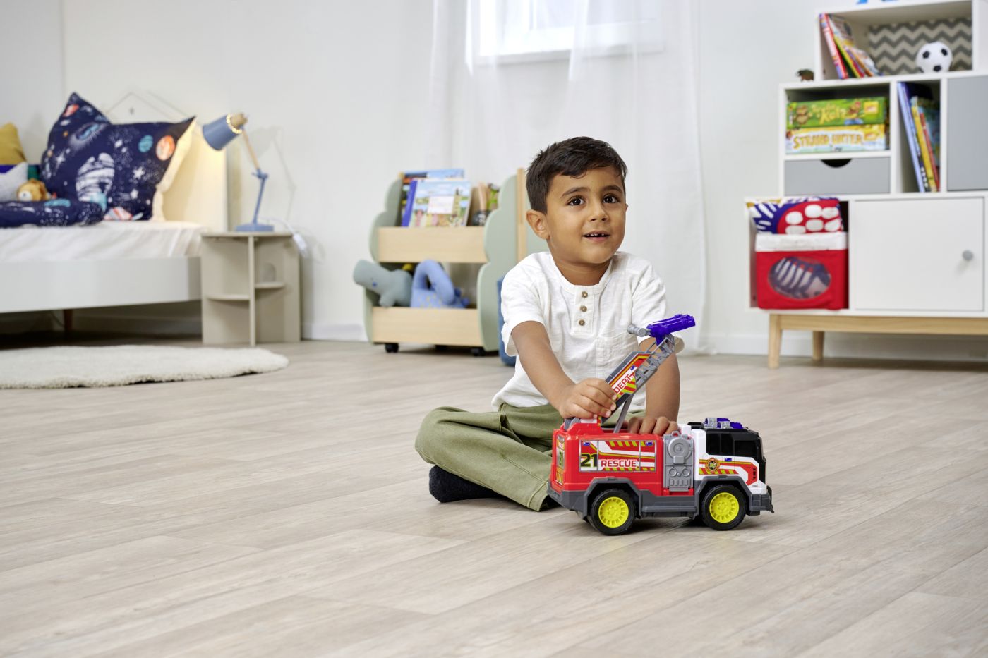 Un adevărat erou pe roți, cu lumini, sunete, scări mobile și un lansator de discuri! Perfect pentru micii salvatori care vor să stingă incendiile cu imaginația lor.