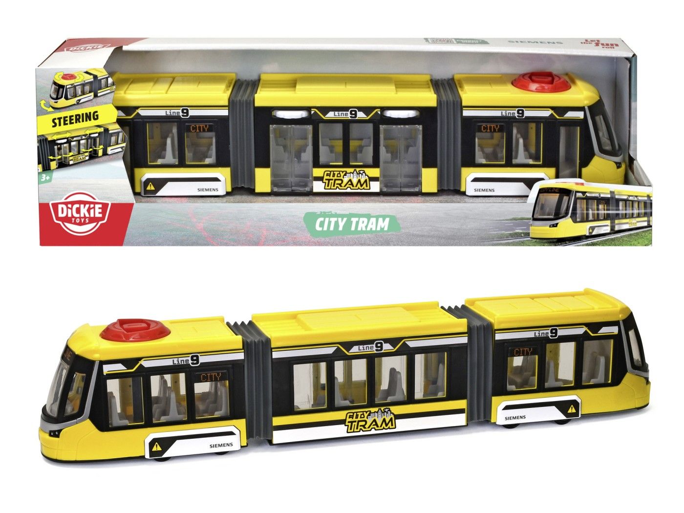 Bine ai venit la bordul tramvaiului Dickie Siemens Avenio! 🚋 Cu o lungime generoasă de 41,5 cm, acest tramvai galben este alegerea perfectă pentru micii pasionați de transport urban.