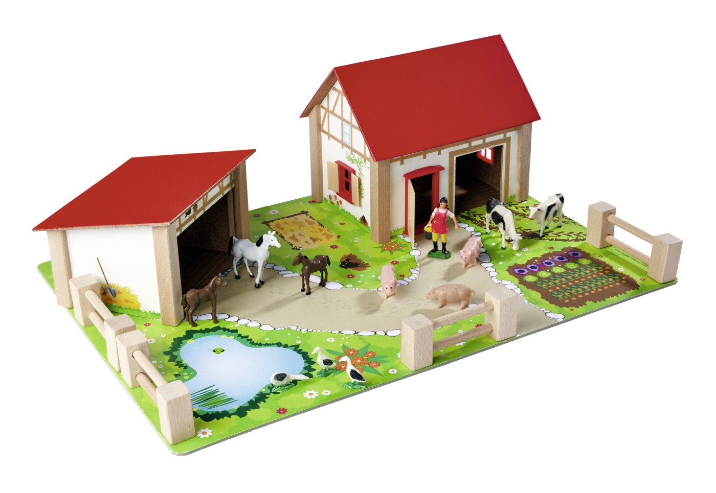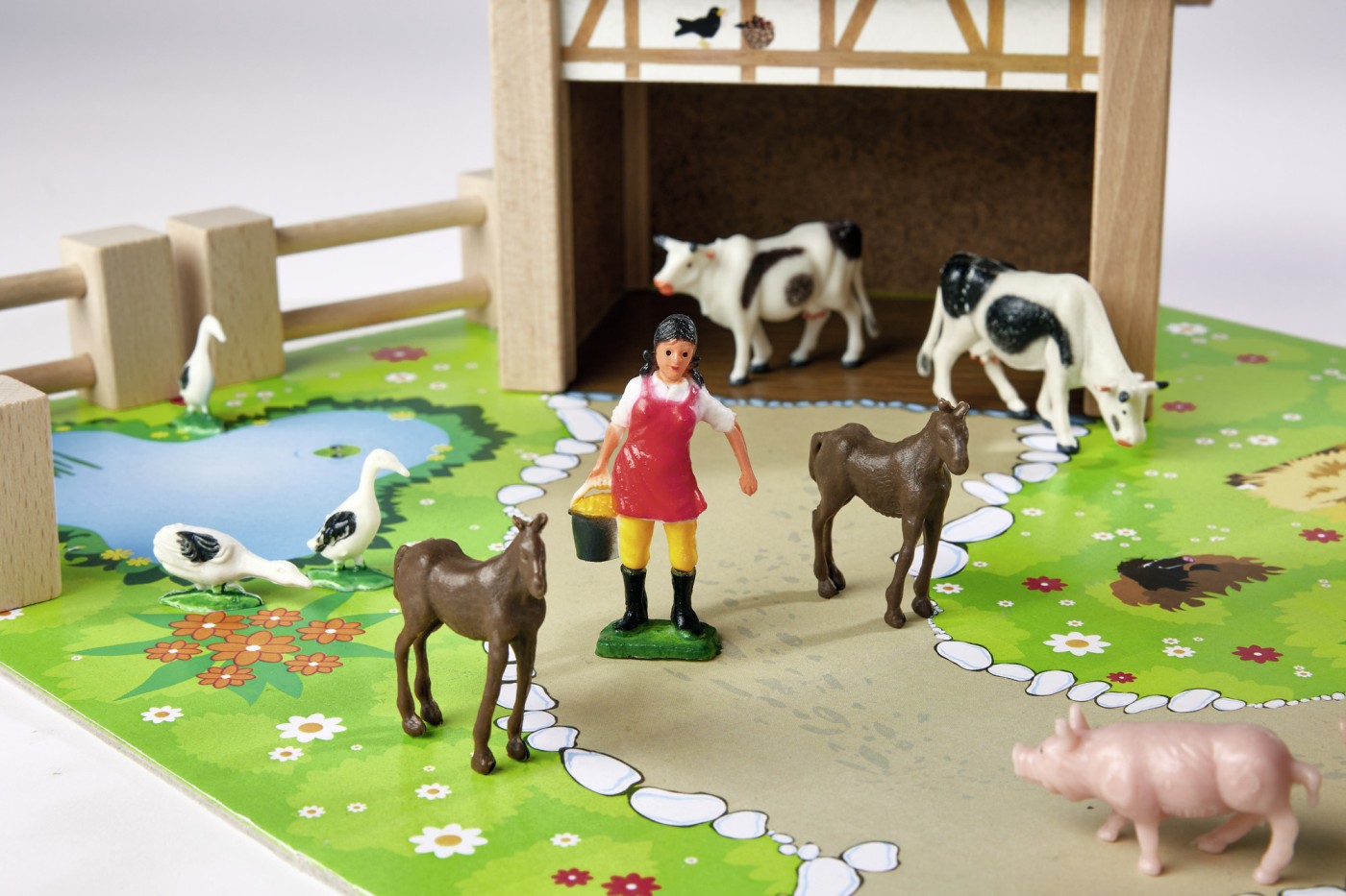 Placa de joaca cu dimensiunea de 36x51 cm creeaza o zona de joaca spatioasa. Fermierul si sotia fermierului locuiesc in ferma, iar animalele locuiesc intr-un grajd mare si confortabil. Ferma include gaste, vaci, porci si cai.