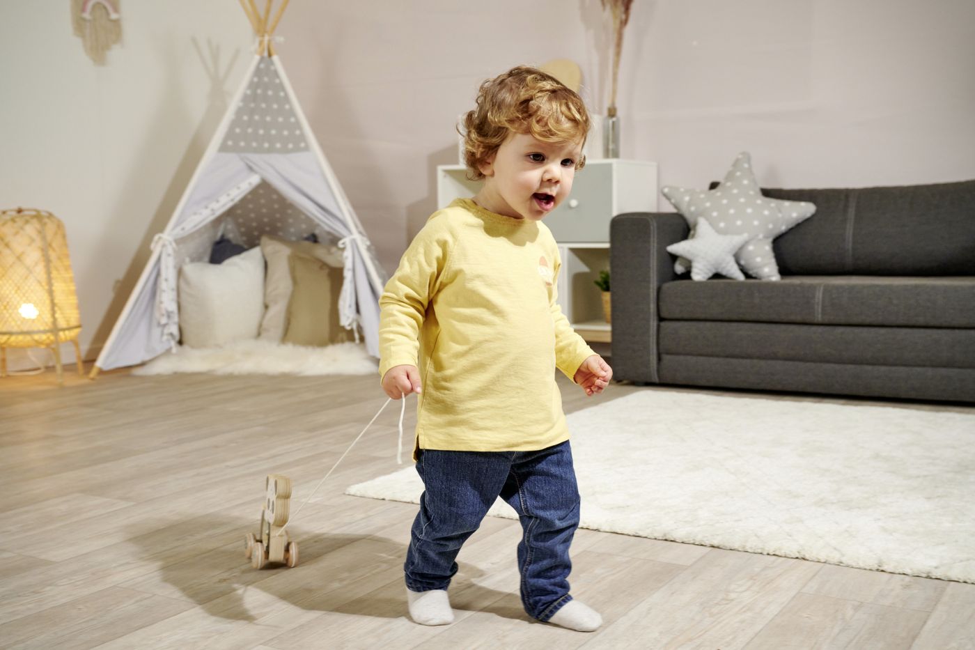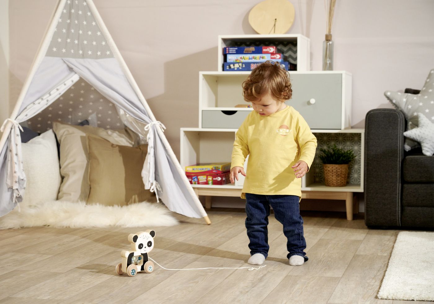 Jucaria de tragere Eichhorn Panda este conceputa pentru a sustine primii pasi ai copilului si pentru a transforma miscarea intr-o activitate distractiva si captivanta. Panda este realizat din lemn de inalta calitate, cu o constructie robusta si finisaje fine, potrivite pentru mainile mici ale copiilor. In interiorul jucariei sunt integrati doi clopotei metalici care scot un sunet placut atunci cand panda este tras sau impins, stimuland astfel simturile auditive si curiozitatea celor mici. Cu o lungime de 15 cm, jucaria are dimensiunea ideala pentru a fi manevrat usor, iar rotile din lemn sunt echipate cu inele de silicon, ceea ce le face silentioase si prietenoase cu orice tip de pardoseala, fara a lasa urme. Designul cu tematica panda, elegant si minimalist, aduce un plus de atractivitate si se potriveste perfect intr-un mediu de joaca natural si calm. Potrivit pentru copiii cu varsta de 1 an si peste, aceasta jucarie de tragere incurajeaza coordonarea, echilibrul si mobilitatea, devenind un companion de nadejde in explorarea mediului inconjurator. Ideal pentru joaca zilnica si pentru dezvoltarea armonioasa a celor mici.