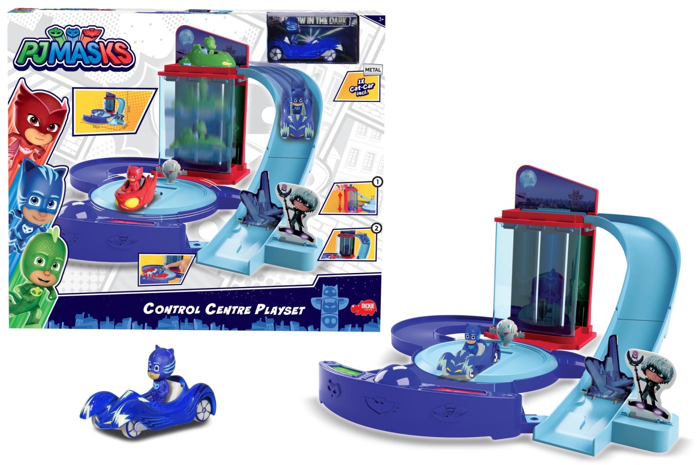 Centrul de comanda Eroi in Pijamale, cu multe functii distractive, cu lift si o masinuta de metal Cat inclusa si figurina, scara masinuta. Eroi in Pijama Control Centre de la Dickie Toys are o multime de aventuri pe care sa le descoperi cu eroii tai preferati. Pista permite lansarea unui vehicul din lift pe o rampa la capatul careia se afla o bariera ce se poate actiona manual. Pista are o placa turnanta manuala si un lift manual si ofera spatiu pentru cei trei eroi din cabina de pilotaj. Setul include o masina de jucarie de inalta calitate, cu volan liber in design Catboy si este, prin urmare, gata de pornire imediata.