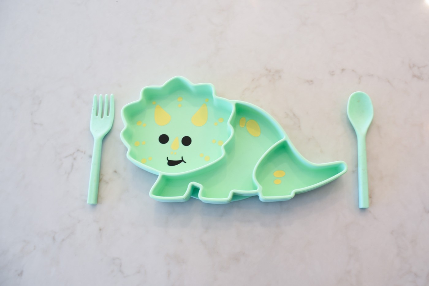 O farfurie verde cu formă de dinozaur, ventuză antialunecare și 3 compartimente – perfectă pentru mesele amuzante și organizate ale copiilor!