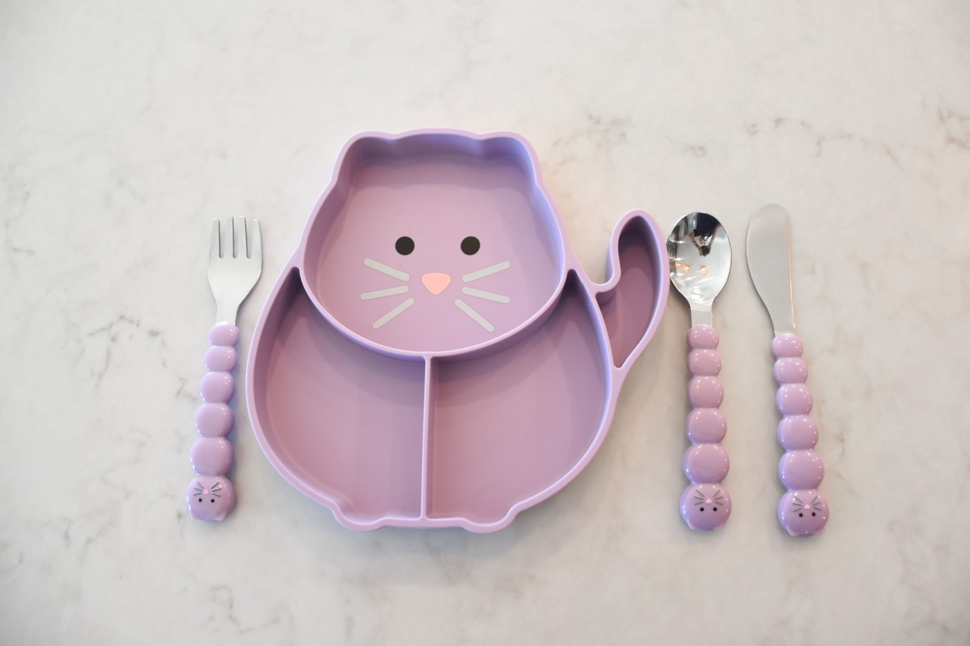 Design adorabil de pisică în nuanțe mov și lavandă, care captează atenția copilului și face masa mai distractivă.