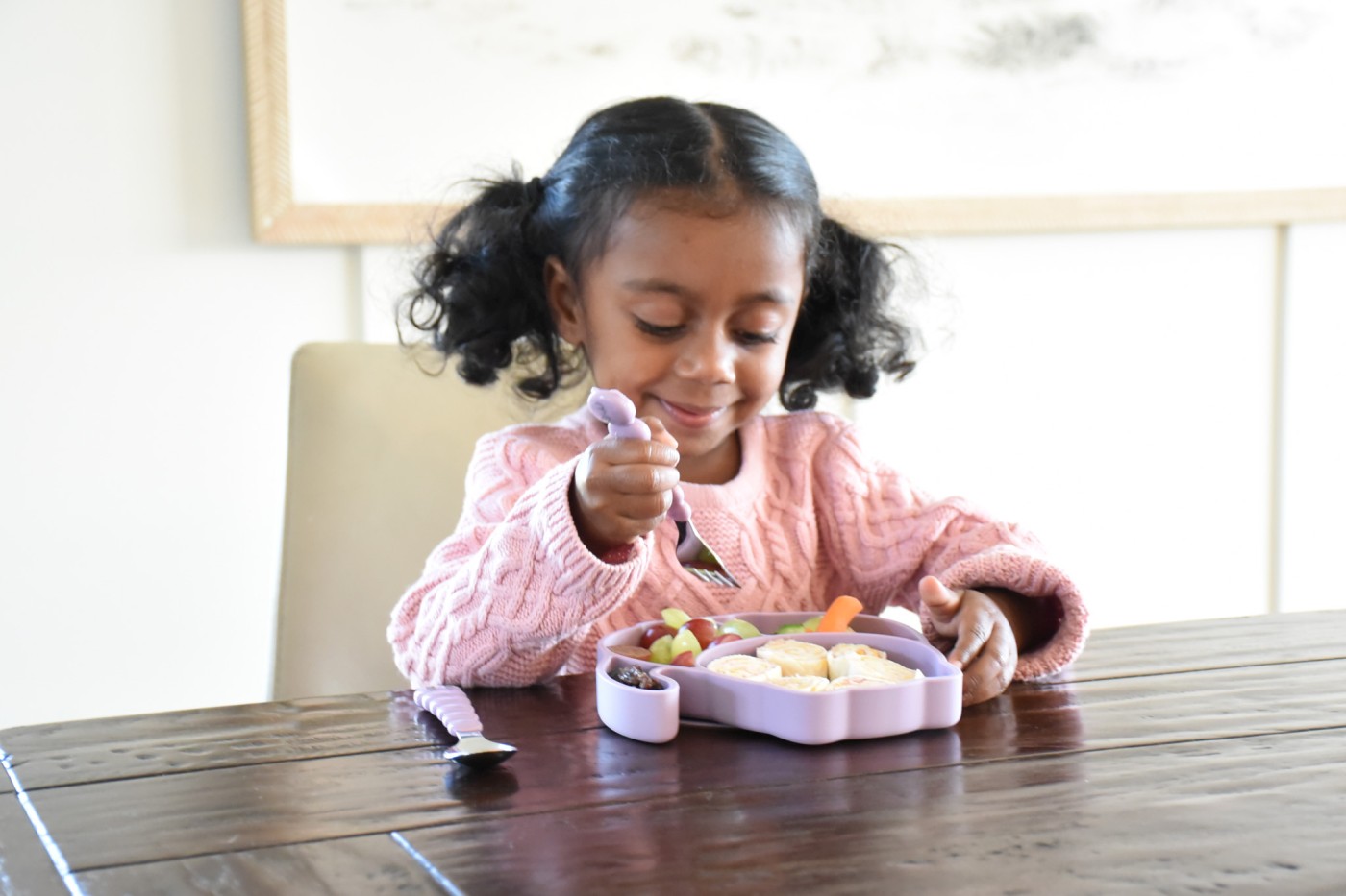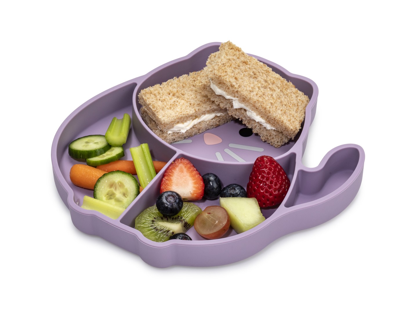 Pisicuța mov de la Melii transformă ora mesei într-un moment adorabil! Farfurie cu ventuză și 3 compartimente, ideală pentru copii curioși și părinți practici.