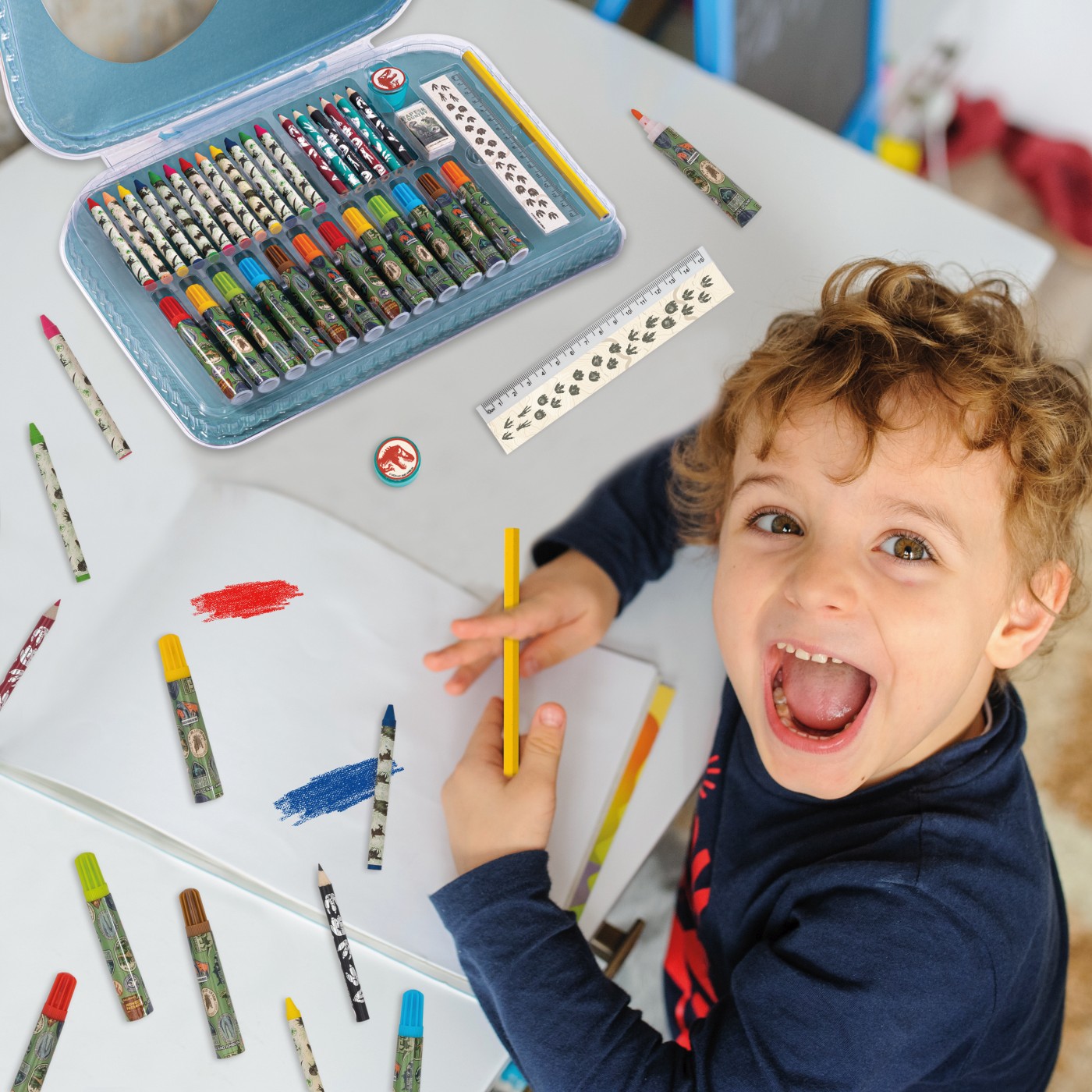 Un set creativ cu dinozauri spectaculoși! Ideal pentru micii exploratori pasionați de desen, culoare și... aventură jurasică!