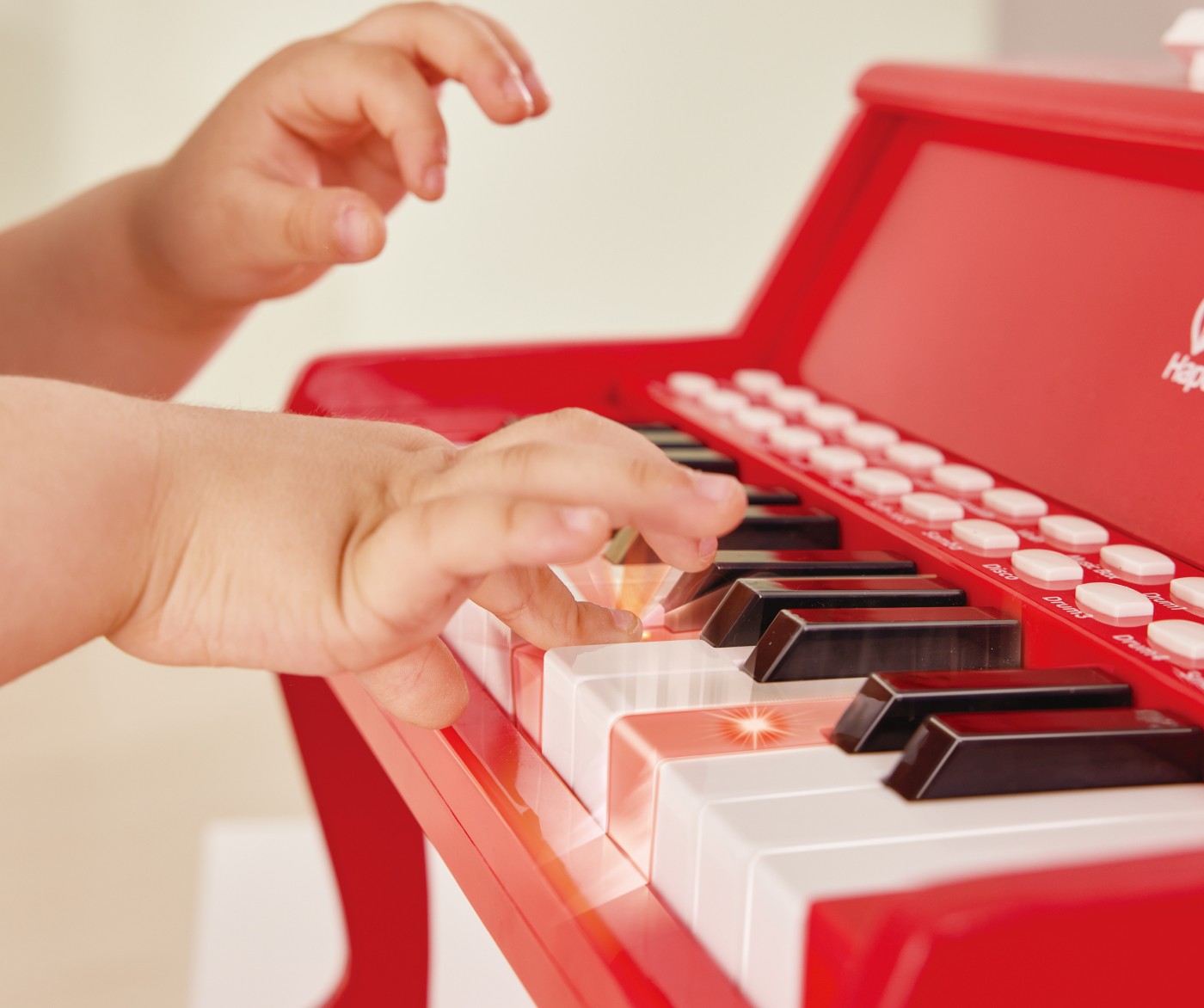 Cu 25 de clape și un scăunel confortabil inclus, acest pian roșu fermecător îi ajută pe cei mici să descopere tainele muzicii. Are sunete realiste de instrumente (inclusiv 8 tobe!), melodii ghidate de lumini și funcție de înregistrare/redare – perfect pentru primele compoziții!