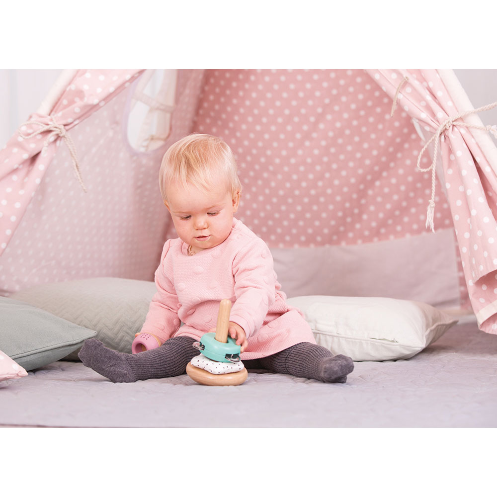 🌈 Turnul este format din mai multe elemente fabricate din lemn, plastic și textile moi. Unele inele scot sunete când sunt mișcate, altele au detalii tactile interesante, precum panglici sau puncte colorate. Copilul va învăța să potrivească, să asculte, să apuce și să exploreze în siguranță fiecare piesă.