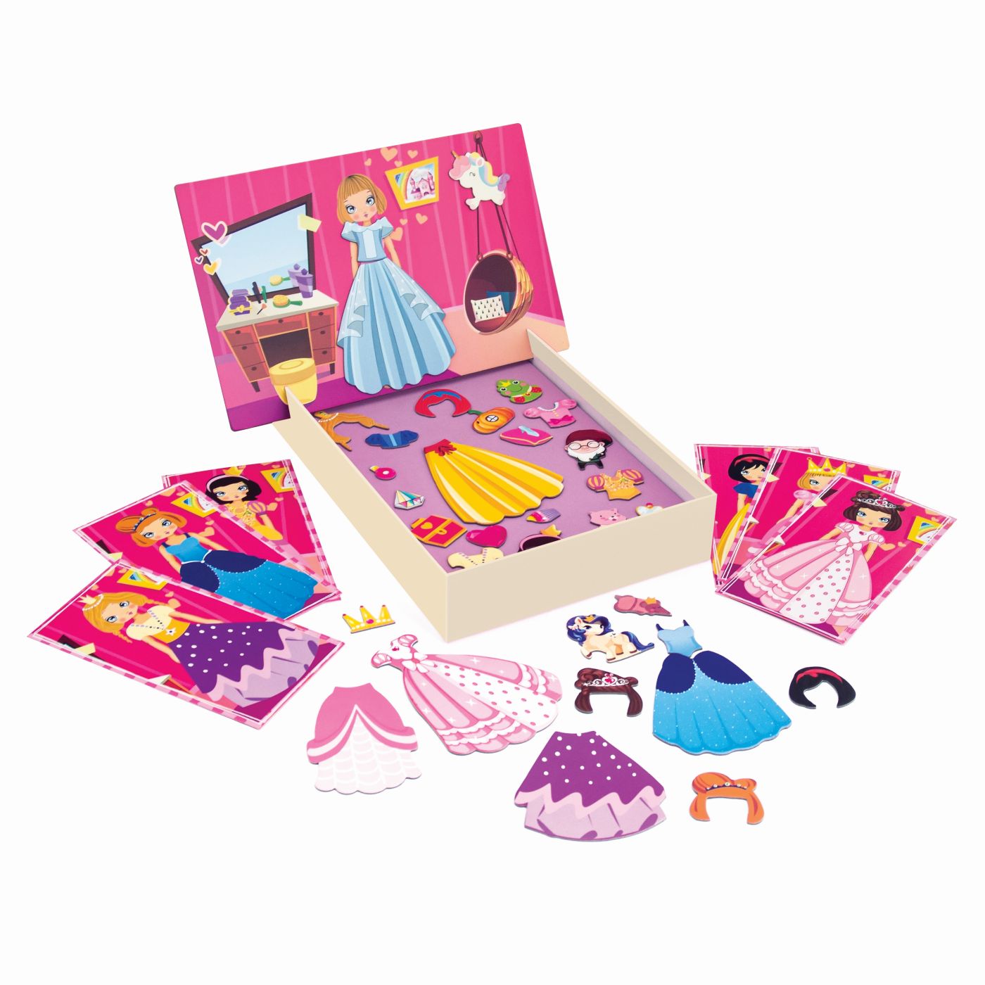 Setul include rochii, coafuri, accesorii și personaje ilustrate, toate realizate din carton magnetic de calitate. Copiii pot potrivi piesele pe planșa inclusă sau pot încerca modele noi în fiecare zi.