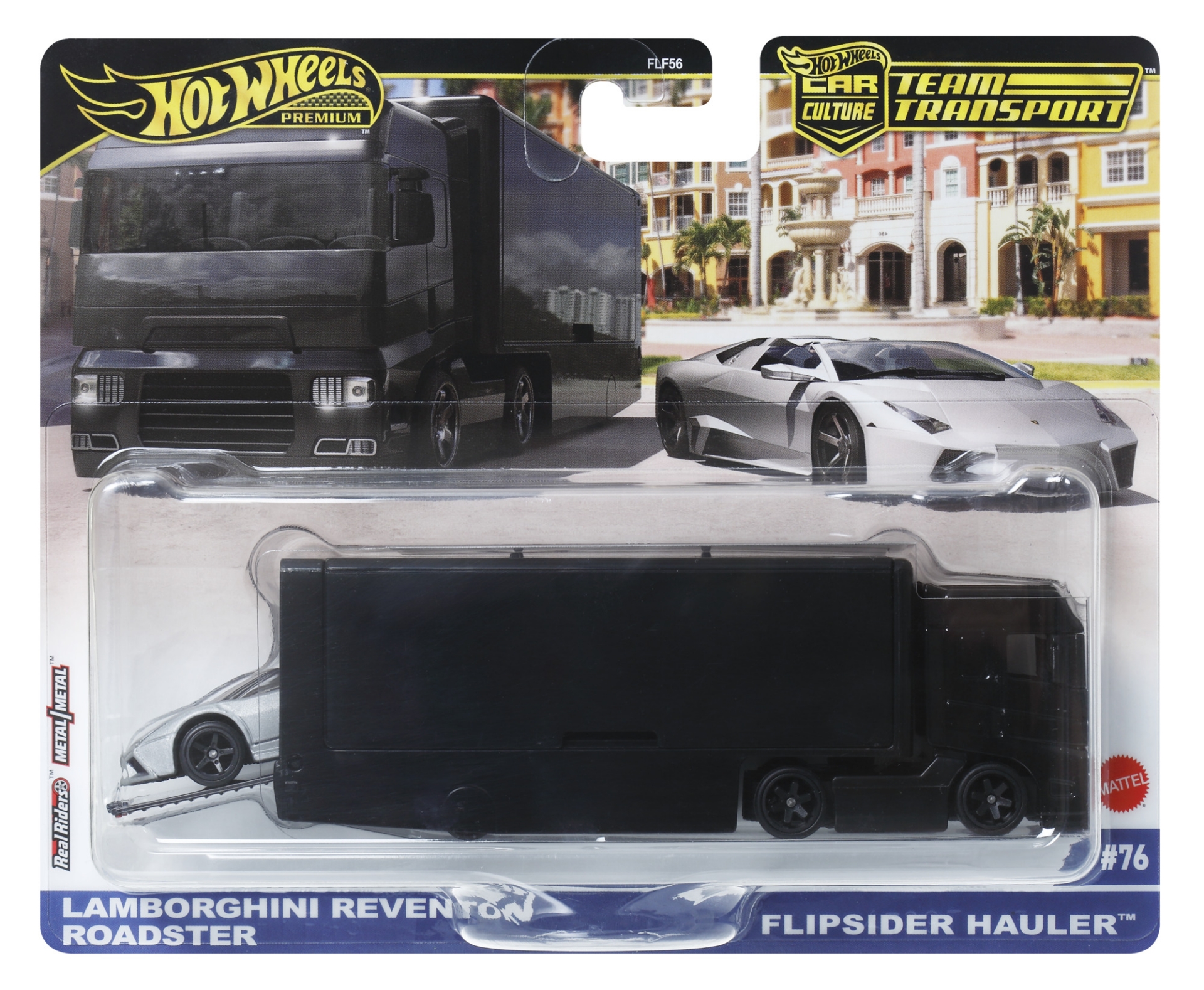 Sortimentul prezinta modele premium de transportatoare la scara 164 ce sunt cautate si indragite atat de copii, cat si de adulti colectionarii si pasionatii din intreaga lume. Realizate cu multa atentie la detalii si decoruri realiste foarte apreciate de cunoscatori. Sunt compatibile cu pistele si seturile de joaca Hot Wheels (achizitionate separat) si prind o viteza uluitoare pe pista! Transportatoarele vin impreuna cu o masina sport Hot Wheels. Fiecare se vinde separat, in functie de disponibilitate. Setul contine un transportor Flipsider Hauler cu masinuta Lamborghini Reventon Roadster.