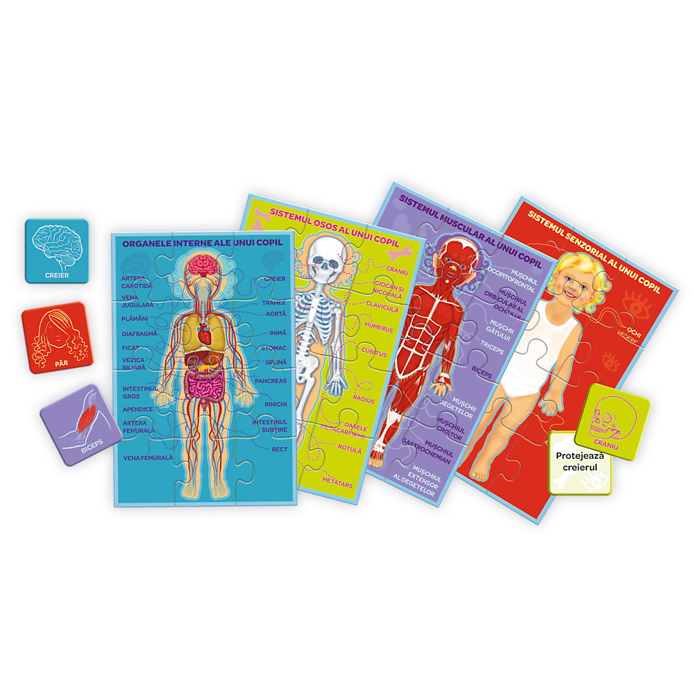 Jocul Corpul meu este un joc simplu pentru prescolari care ii introduce pe copii in structura corpului uman. În timpul jocului, copiii invata nu numai numele partilor corpului, ci si organele interne, oasele si muschii. Este o sursa de cunostinte despre corpul uman, perfect adaptata varstei copilului. Include 4 table de puzzle, 24 de piese, instructiuni cu multe sugestii pentru joc. Jocul poate fi jucat in minim 3 persoane si maxim 5 persoane.