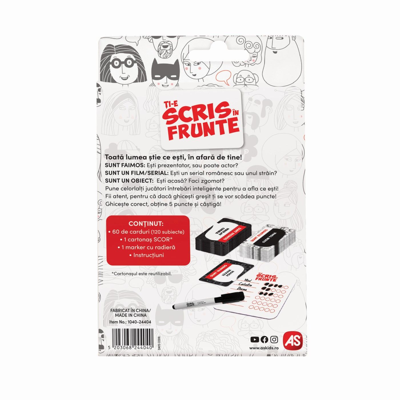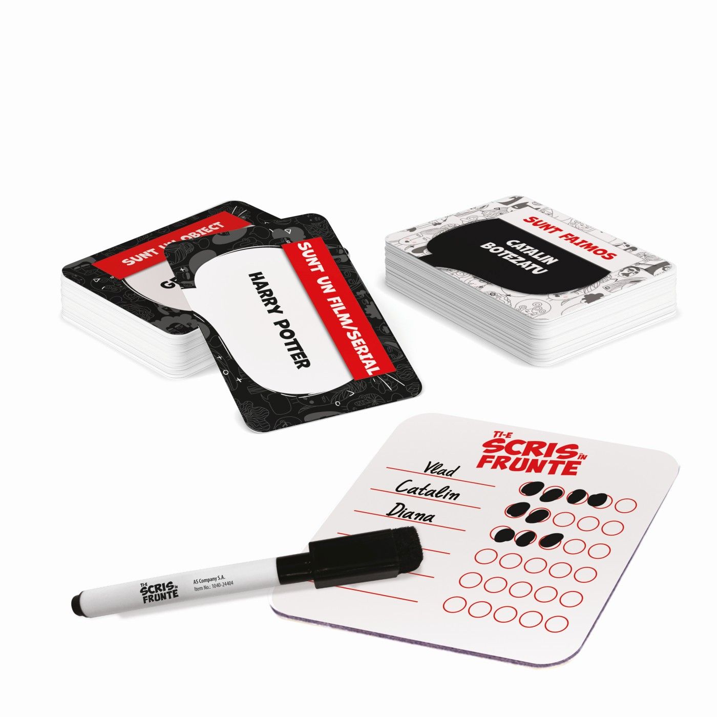 Jocul include 60 de carti cu 120 de teme, 1 carte de punctaj (refolosita), 1 marker cu guma de sters, o brosura de instructiuni.