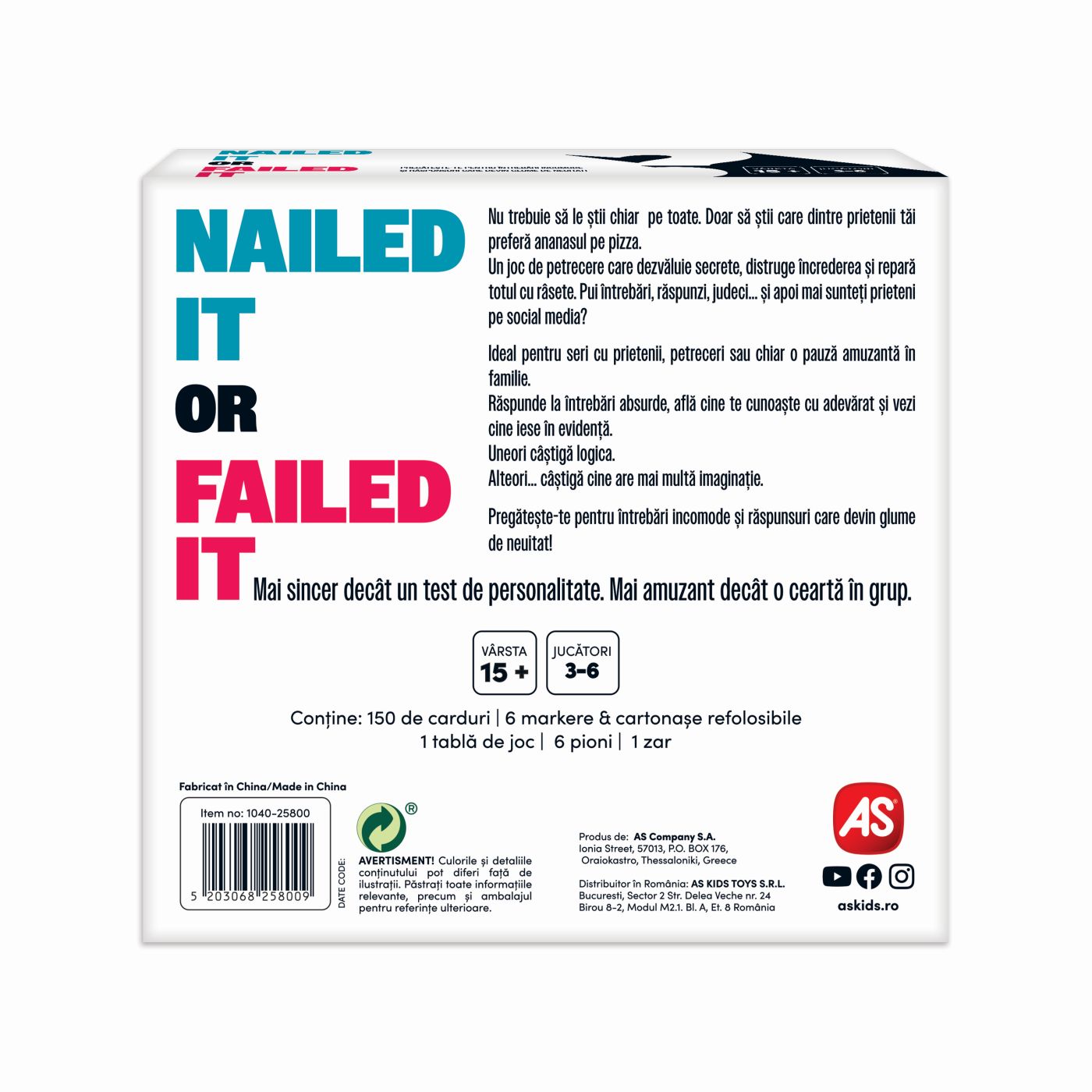 „Nailed It or Failed It” este jocul perfect pentru distracție rapidă, momente amuzante și seri pline de voie bună. Ideal pentru întâlniri cu prietenii, petreceri, reuniuni de familie sau chiar pauze scurte care au nevoie de un plus de energie, jocul îți pune la încercare spontaneitatea și creativitatea.