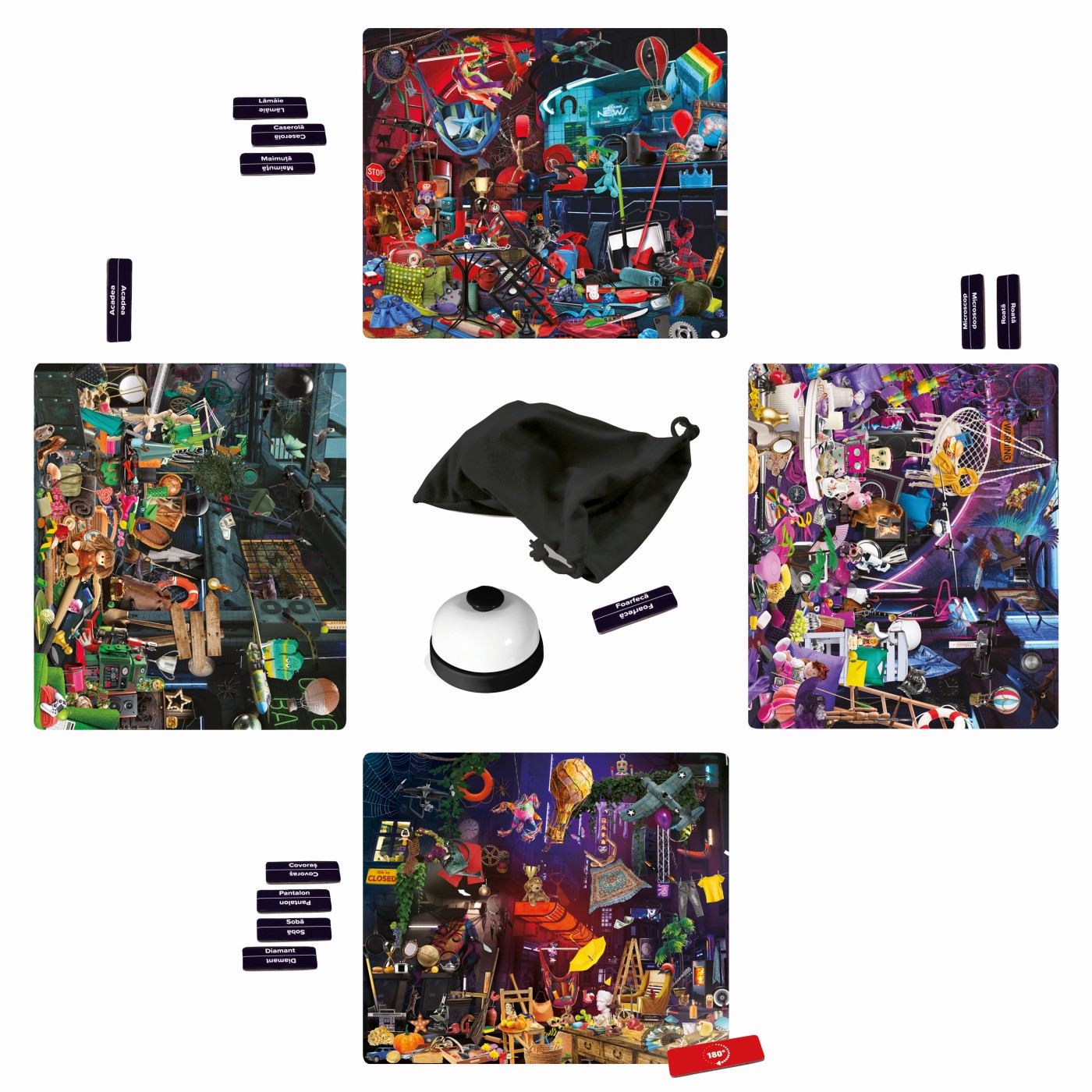 Jocul contine 6 planse, 150 carduri cu obiecte,16 carduri de actiuni, 1 saculet din panza,1 sonerie, brosura cu instructiuni. Joc de Societate Obiecte Ascunse Underground. Aventura incepe sub pamant. Exploreaza tuneluri misterioase, camere secrete si pasaje ascunse in cautarea obiectelor pierdute. Un joc captivant de observatie si logica, perfect pentru intreaga familie sau pentru o seara distractiva cu prietenii. Fii rapid, atent si descopera toate obiectele inaintea celorlalti. Esti pregatit sa intri in lumea subterana.
