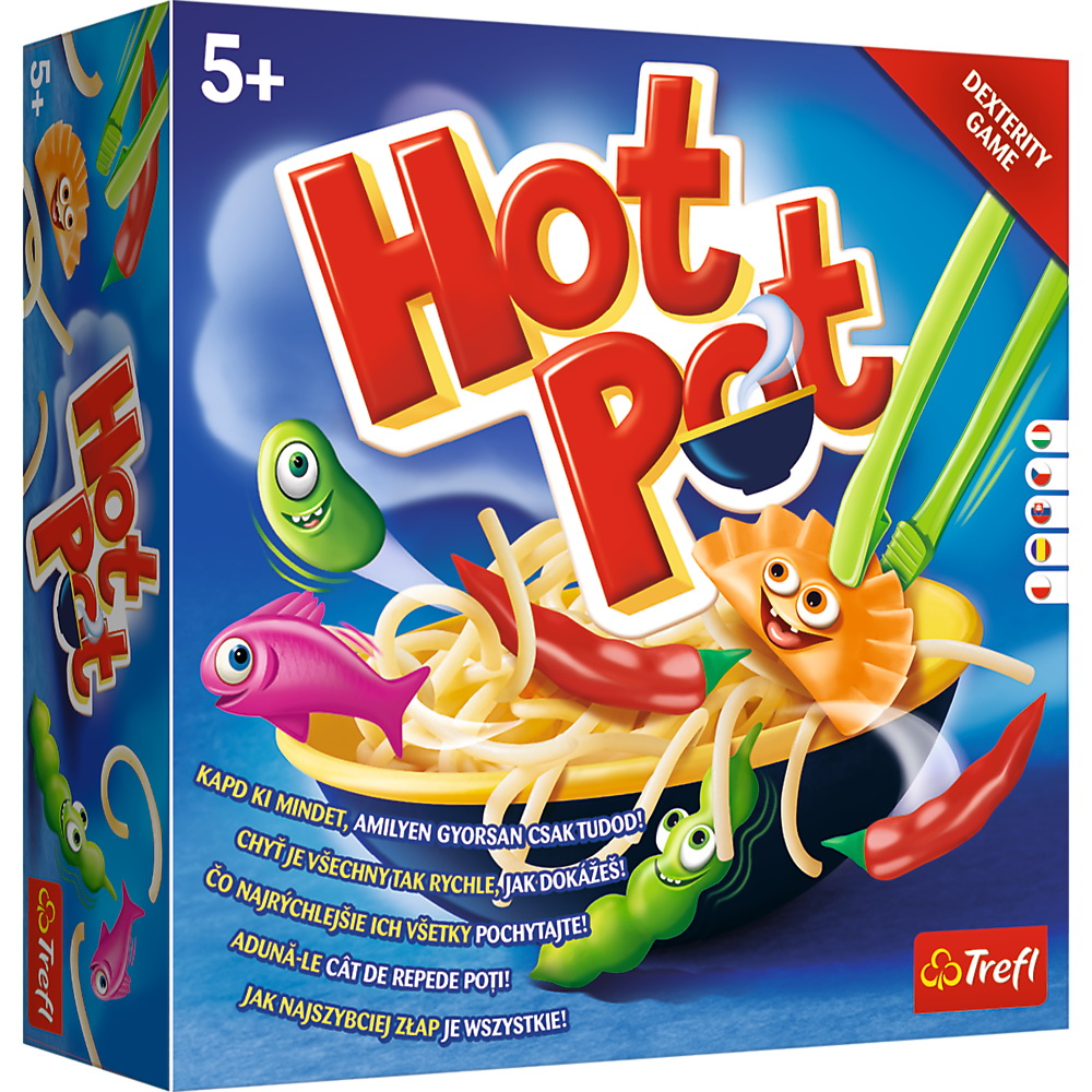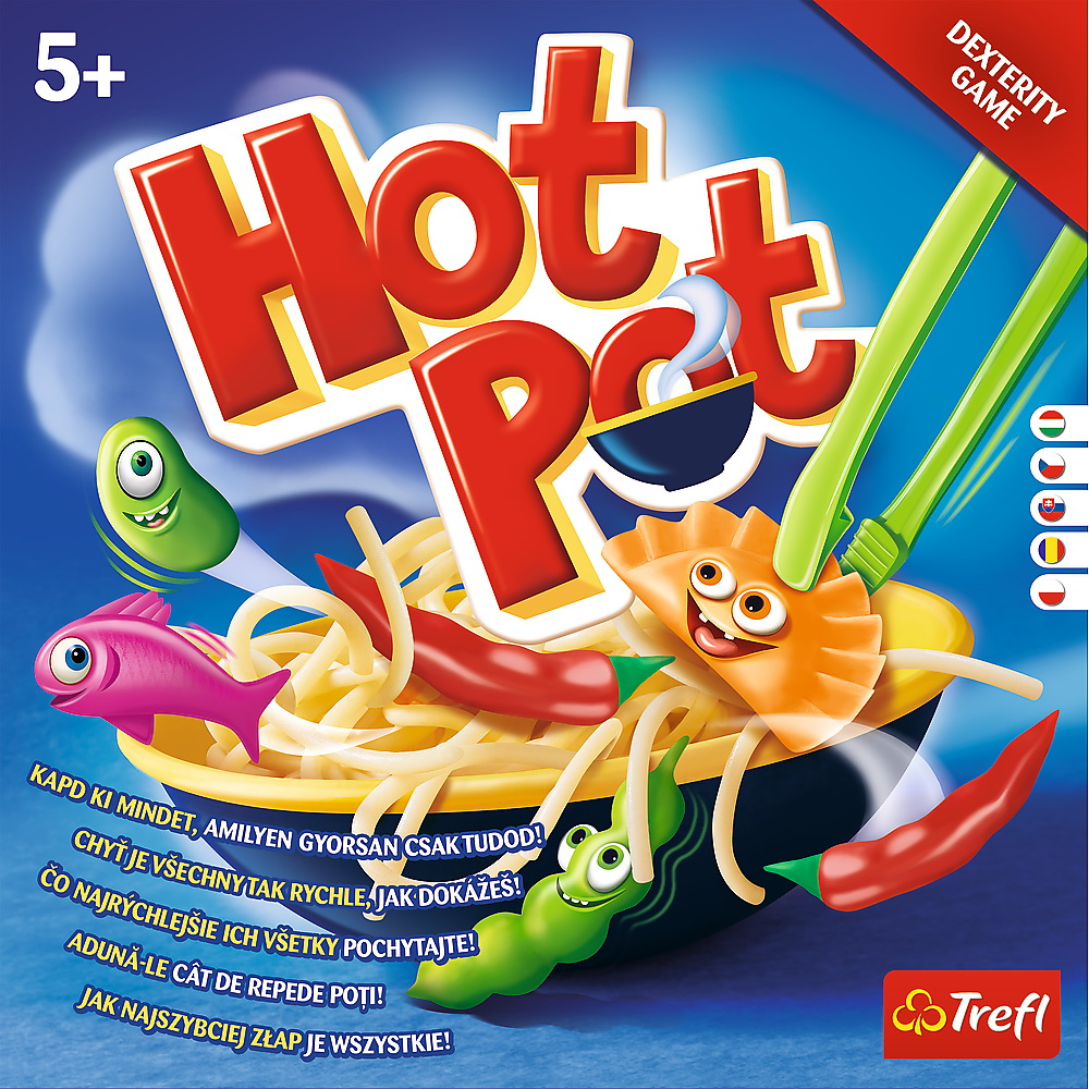 Încercati sa scoateti mancarea potrivita din oala! Dezvaluiti o carte si uitati-va ce ingredient trebuie sa cautati. Puteti folosi carligele sau betisoarele, precum si propriile maini agile! Sa luam ceva de mancare cu un joc uimitor de dexteritate. Pare simplu ? Mai gandeste-te. Cutia contine 4 pensete, betisoare de bambus, paste, 1 castron, 56 de sarcini pe 28 de carti si 40 de alimente. Numarul de minim de jucatori este 2 si maxim 4.