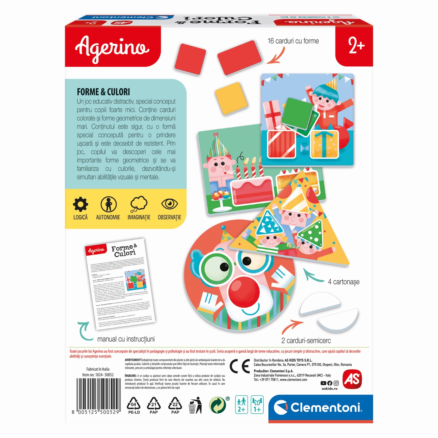 Forme & Culori este un joc educativ distractiv special conceput pentru copiii foarte mici. Acesta contine carduri colorate si forme geometrice de dimensiuni mari. Continutul este sigur, deosebit de durabil si special conceput pentru a fi usor de inteles. Prin joc, copilul va descoperi cele mai importante forme geometrice si culori, dezvoltandu-si simultan abilitatile vizuale si mentale.