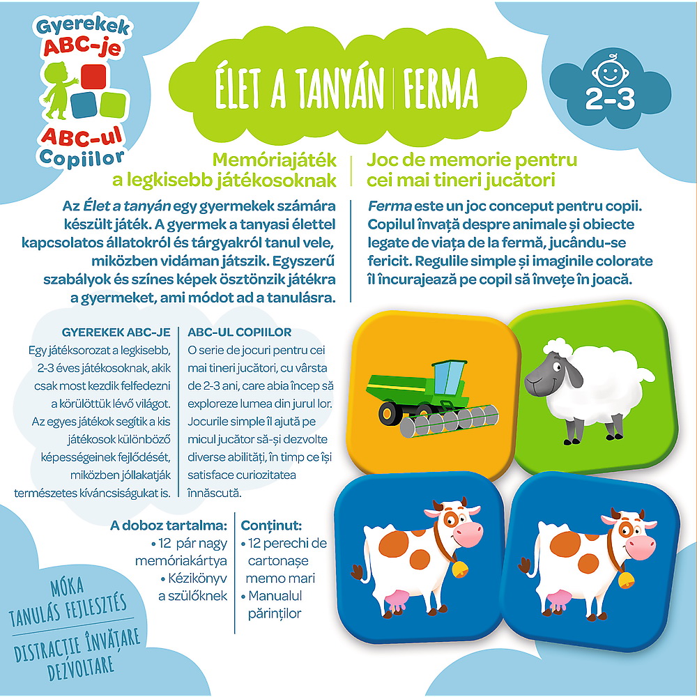 Este de fapt un joc de memorie excelenta pentru copii, care ii introduce pe copii in viata si obiectele din ferma, in timp ce se bucura de entuziasmul jocului. Regulile simple, imaginile colorate si interesante incurajeaza copiii sa se joace, ceea ce imbunatateste si memoria si atentia celor mici. ABC-ul Copiilor este o serie de jocuri pentru cei mai mici jucatori, pentru copii de doi, trei ani care abia incep sa exploreze lumea din jurul lor. Fiecare joc ii ajuta pe jucatorii mici sa-si dezvolte abilitati diferite, satisfacand in acelasi timp curiozitatea lor naturala.Continut 21 pereche carti de memorie, un manual pentru parinti