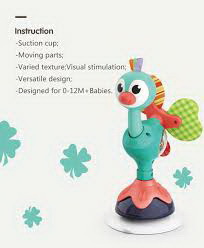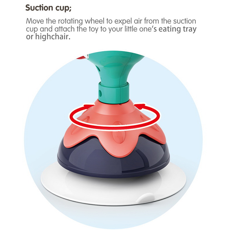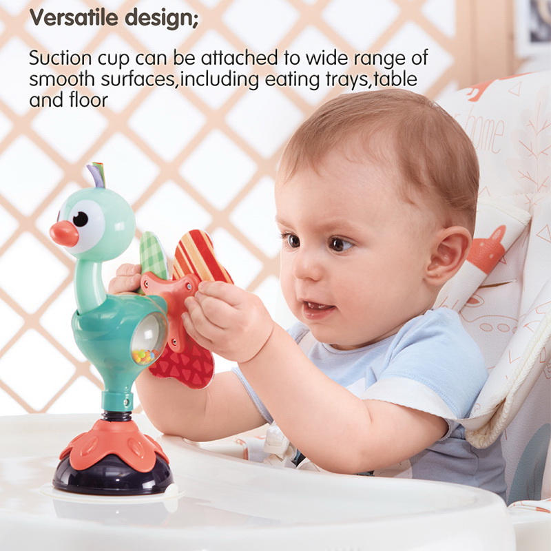 Jucăria cu ventuză în formă de păun este un prieten vesel și educativ care se fixează sigur pe masa de joacă, scaunul copilului sau podea. Odată montată, începe distracția: copilul poate explora mișcările, culorile și texturile într-un mod sigur și captivant!