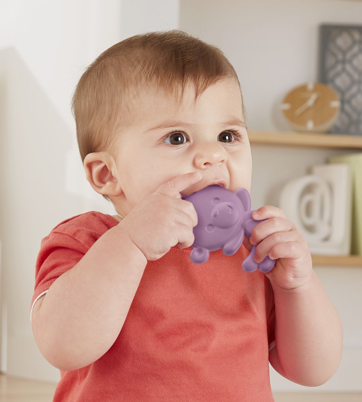 Măimuțica Mov de la Fisher-Price este o jucărie de dentiție concepută special pentru bebelușii începând cu vârsta de 3 luni, oferind confort gingiilor sensibile și o experiență tactilă plăcută.