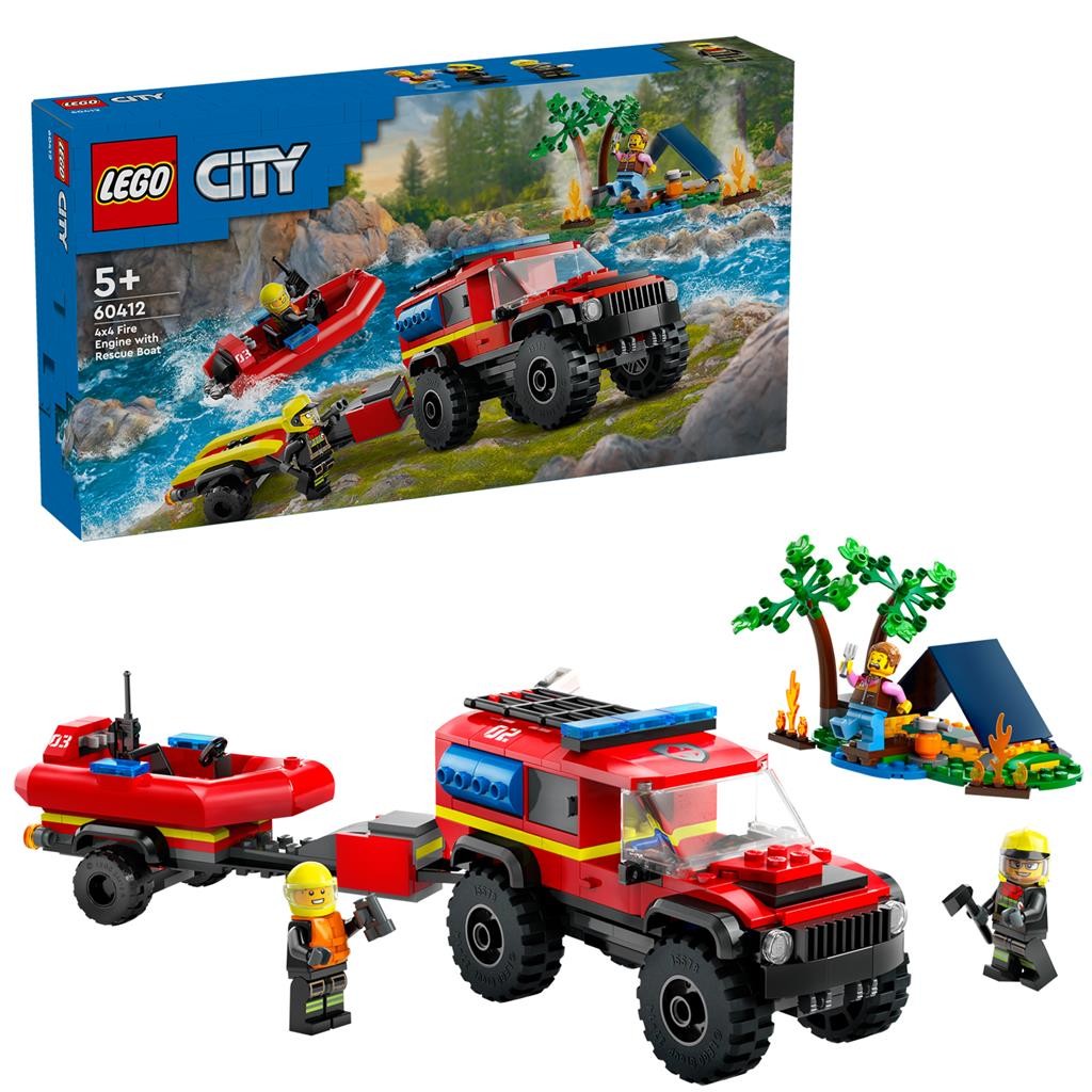 Setul LEGO City Camion 4x4 și barcă de pompieri 60412 este perfect pentru aventuri în aer liber! Include un camion cu remorcă, barcă de salvare, loc de camping și minifigurine gata de acțiune.
