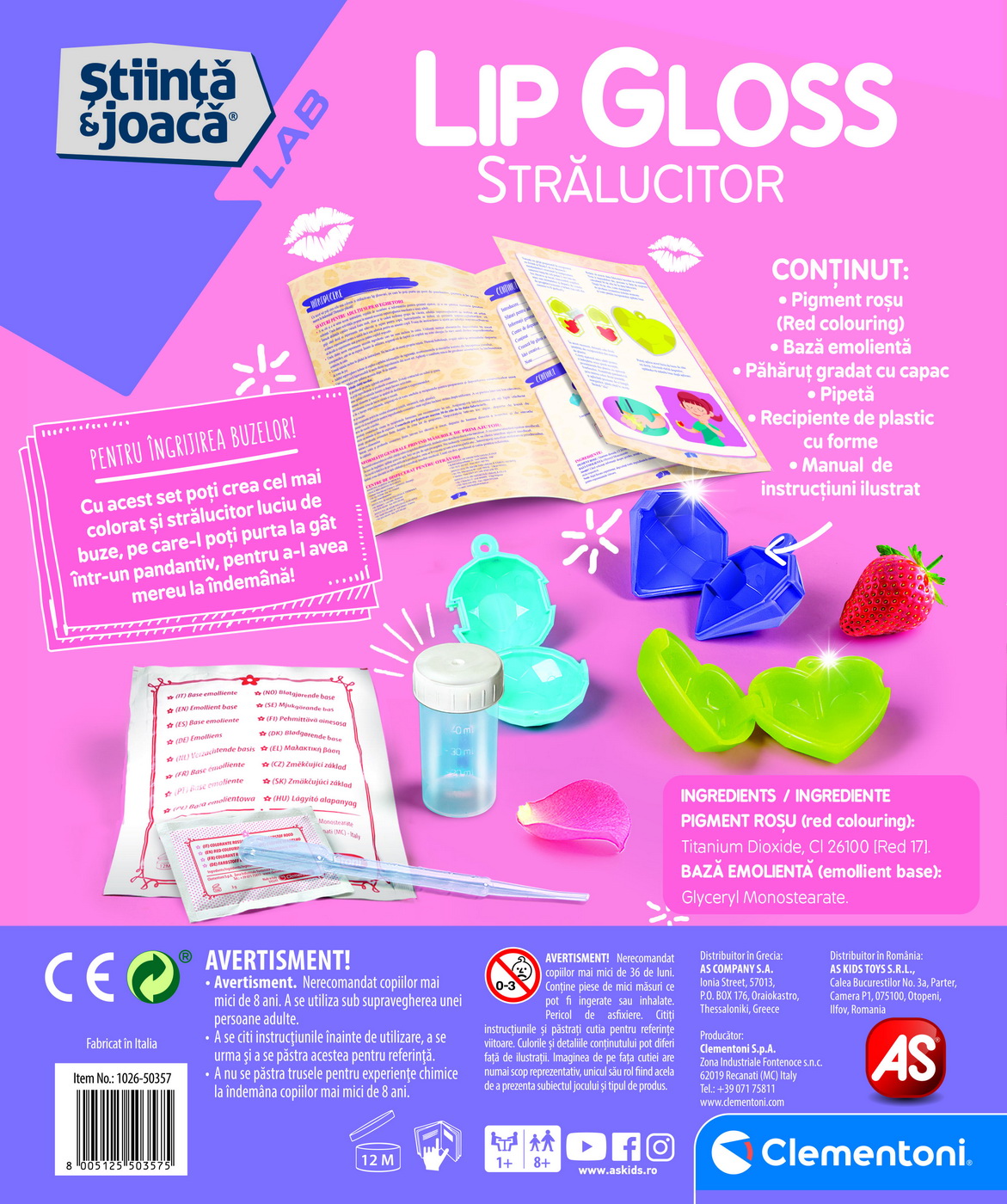 Seturile Stiinta & Joaca imbina distractia cu educatia! Cu acest set copilul poate crea cele mai stralucitoare balsamuri de buze si descoperi pas cu pas stiinta produselor cosmetice. Balsamurile create pot fi purtate mereu intr-un pandantiv, pentru buze moi si catifelate! Setul contine o baza emolienta, 3 recipiente cu forme, paharut cu capac, colorant rosu si un ghid de instructiuni bogat si ilustrat. Manualul va oferi informatii utile despre istoria parfumurilor si a produselor cosmetice, si va indruma copilul pas cu pas in realizarea balsamului de buze. Setul este recomandat pentru copiii de la 8 ani.