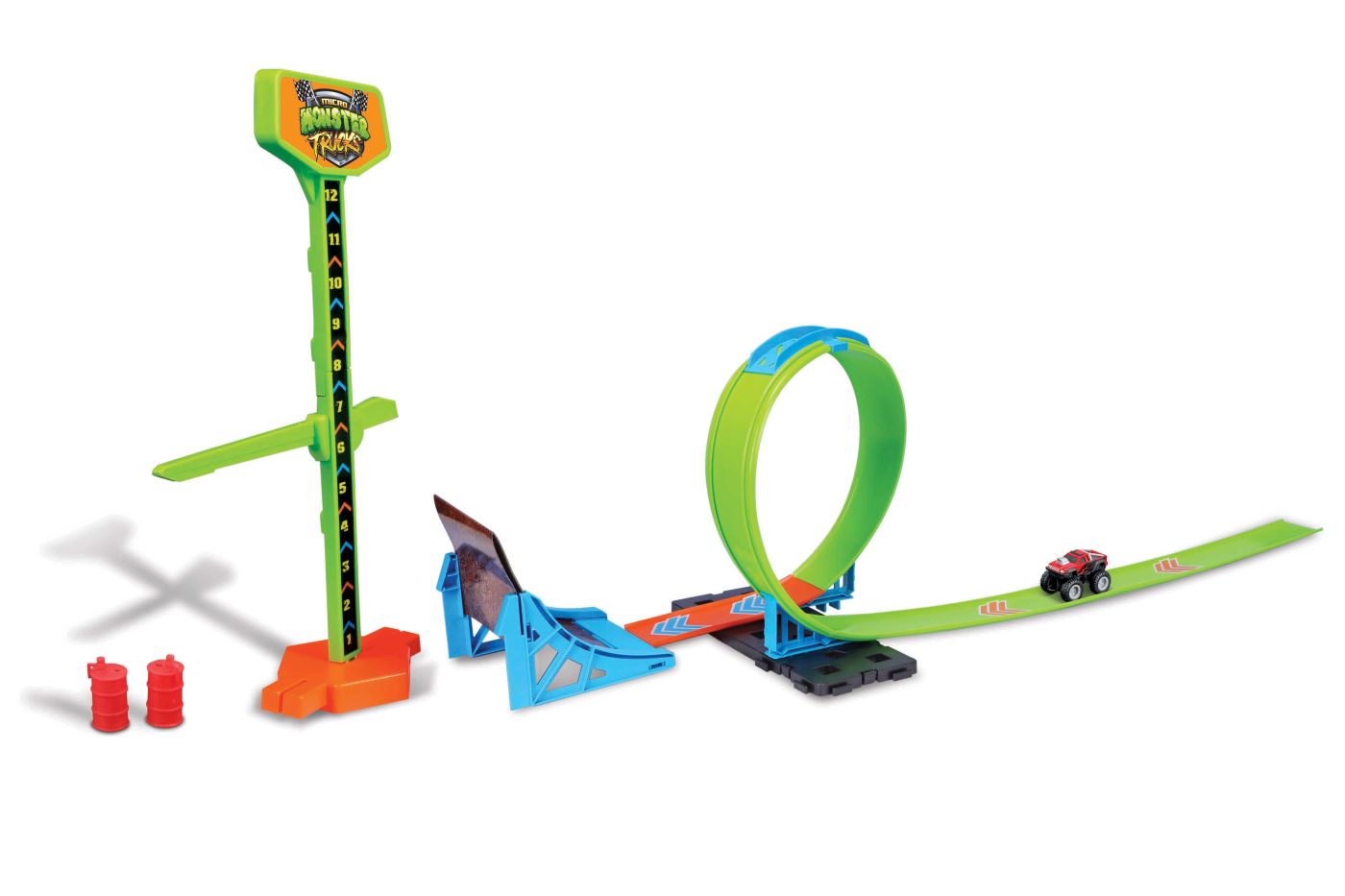 Pista include o buclă spectaculoasă, o rampă de lansare și un marcator de înălțime ajustabil, pentru a transforma fiecare săritură într-o competiție: cine lansează monster truck-ul cel mai sus? Setul vine cu etichete decorative pentru personalizarea pistei și a mașinuței, adăugând un plus de stil și creativitate.