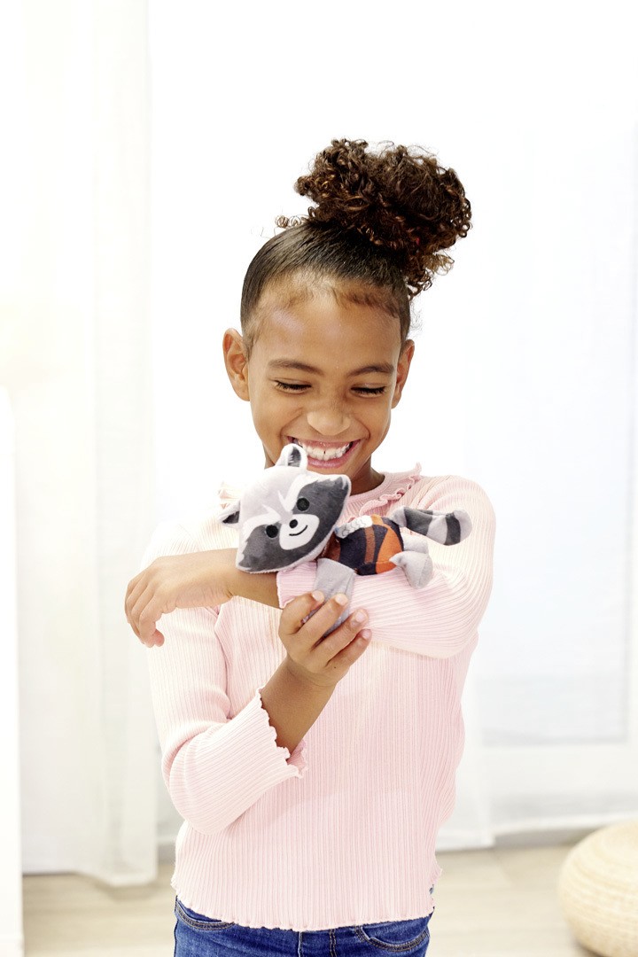 Rocket Raccoon e gata de acțiune și de joacă! Brățara moale cu figurina eroului Marvel se prinde ușor pe mână, ghiozdan sau picior, pentru distracție pe loc.