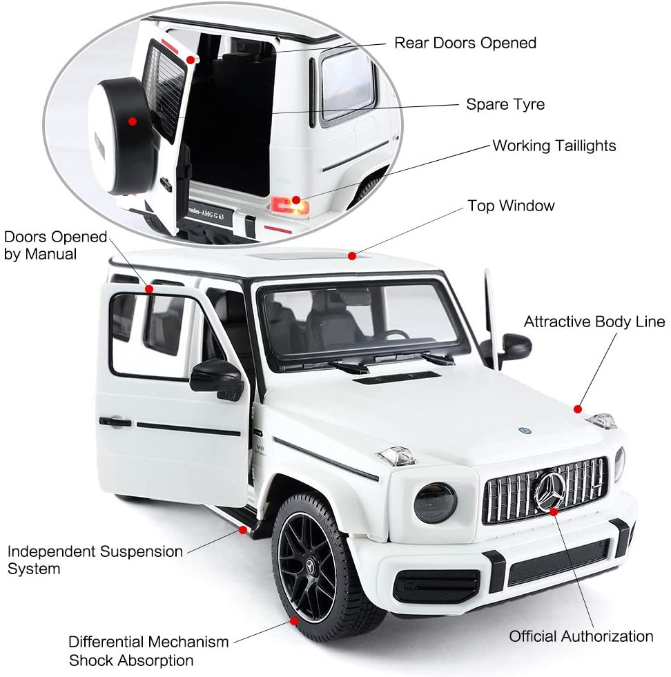 Copilul dumneavoastra se poate juca in voie cu masina cu telecomanda Mercedes Benz G63, scara 1 la 14, oferita de brandul international Rastar. Nicio cursa nu este imposibil de castigat cu acesta masinuta, replica oficiala cu licenta a modelului original, construita cu mare atentie la detalii. Masinuta are proportiile ideale pentru momente pline de distractie si amuzament, avand dimensiunile in centimetri dupa cum urmeaza 32.3*14.8*13.9.Masinuta functioneaza pe frecventa de 2.4G.Alimentarea se face astfel pentru masinuta sunt necesare 5 baterii tip AA , iar pentru telecomanda 2 tip AA.Masinuta se poate deplasa in toate directiile inainte, inapoi, stanga sau dreapta. Masina cu telecomanda Mercedes Benz G63, scara 1 la 14, poate rula cu o viteza aproximativa de 10km/h, are tractiune 2WD, anvelope de cauciuc, posibilitate de reglaj a directiei direct pe sasiu si o raza de actiune a telecomenzii de circa 20 de metri.Acesta masinuta are si o functie suplimentara care face ca farurile si stopurile masinutei sa lumineze.