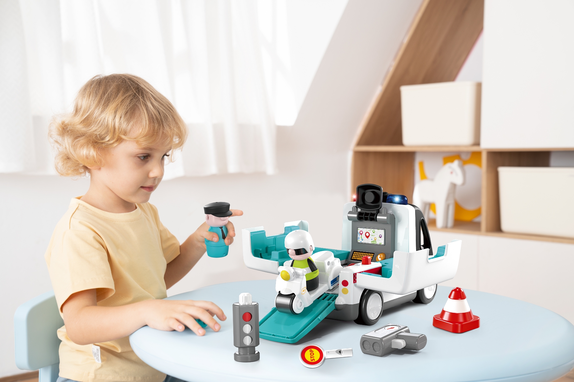 Jucăria include o mașinuță de poliție, un polițist de jucărie, o motocicletă și semne de circulație. Copiii pot crea propriile scenarii: opriri în trafic, misiuni de salvare, patrulări sau situații amuzante din oraș. Jocurile de rol sunt excelente pentru dezvoltarea creativității și a comunicării.