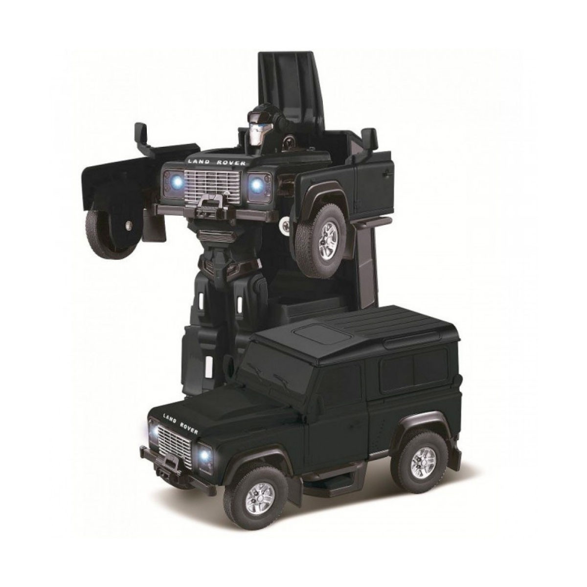 Descoperă mașinuța metalică Land Rover Defender negru, scara 1:32, care se transformă spectaculos într-un robot. Design realist, efecte luminoase și o joacă plină de acțiune!