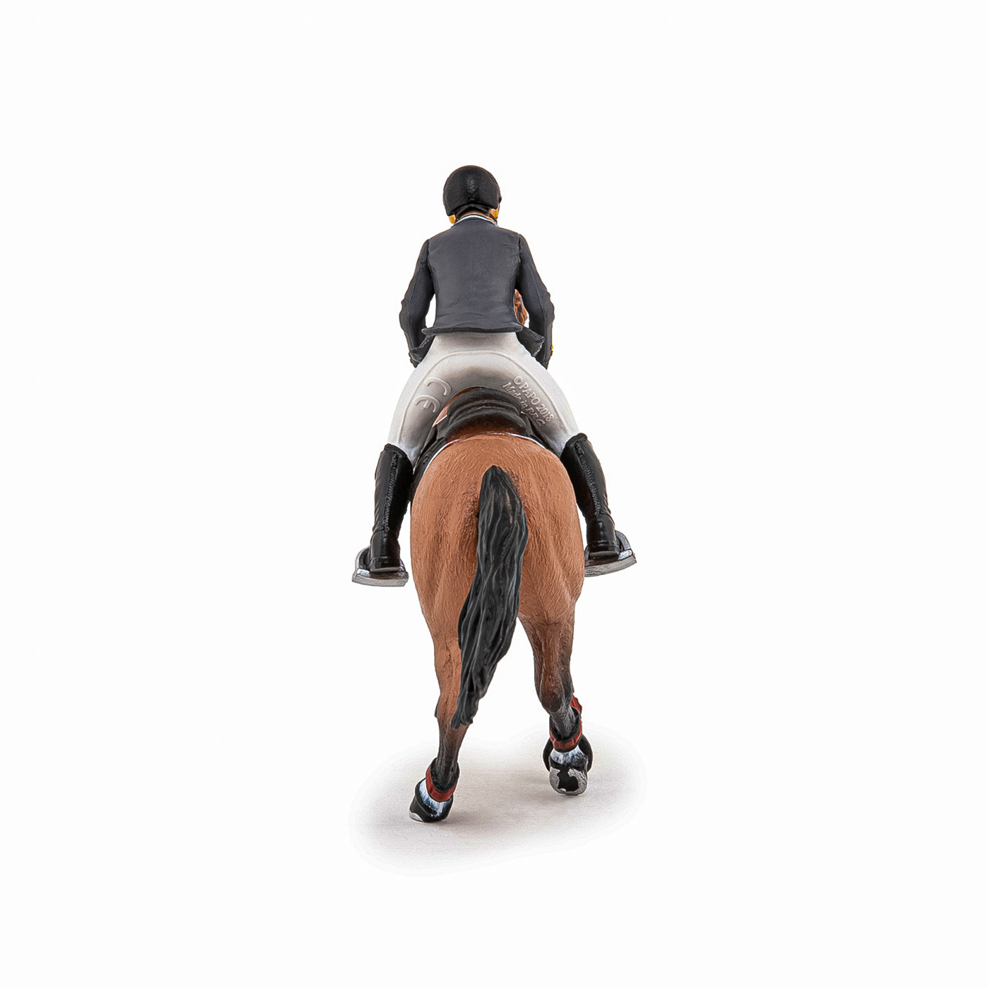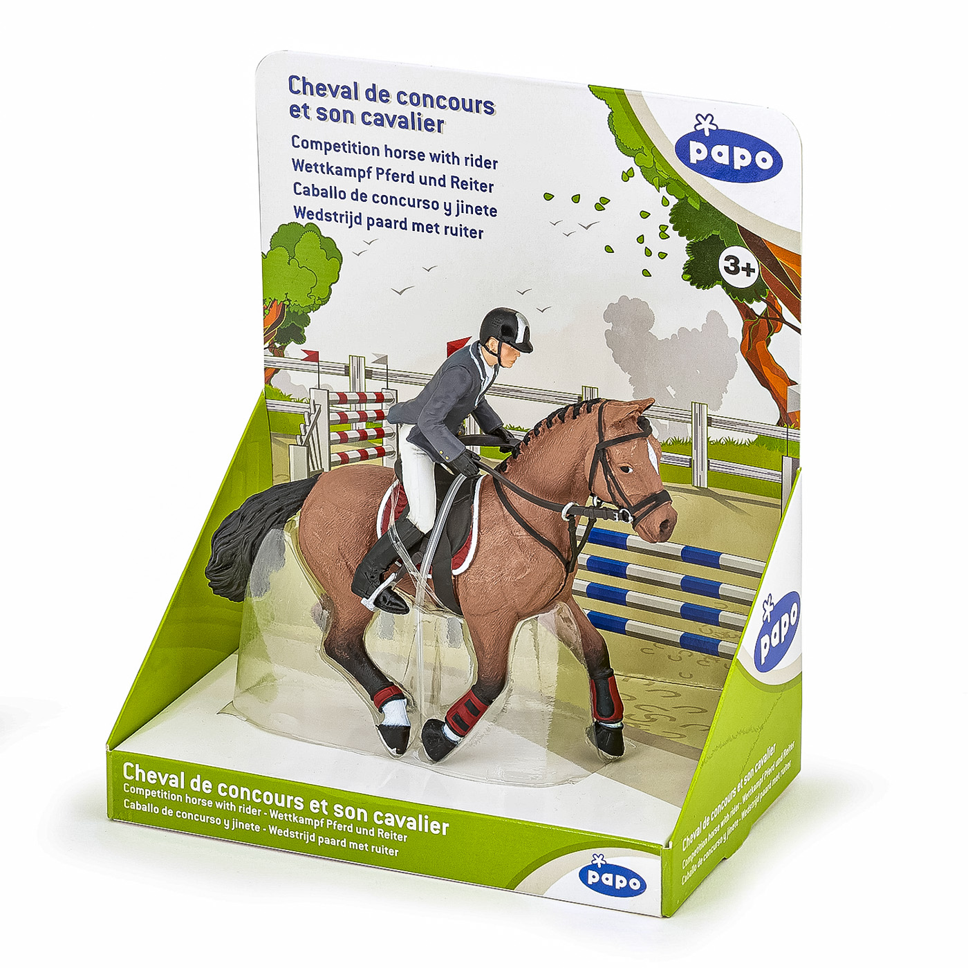 Faceti o plimbare prin campuri cu ecvinele Papo, participati la concursuri de sarituri sau chiar la cursuri de dresaj. Tensiunea este la maxim pe traseul de sarituri, tanarul calaret insotita de calul ei se pregateste sa treaca de ultimul obstacol care ii desparte de victorie. Regula este simpla, pentru a castiga este necesar ca impreuna sa o treaca fara sa o rastoarne. Produsul are urmatoarele dimensiuni 10 x 16 x 19cm si este recomandat copiilor cu varsta peste 3 ani. De mai bine de 20 de ani, Papo inoveaza constant si ii face pe copii din intreaga lume sa viseze cu o gama bogata de peste 600 de produse, reprezentand 12 lumi, animale si personaje. De la modelul original la serie, fiecare dintre figurinele Papo a fost conceputa si creata in Franta pentru a fi fabricata intr-o permanenta preocupare pentru calitate. Pictate manual, atentia la detalii este acum recunoscuta. Figurinele Papo se disting prin acuratete si realism, detaliile sunt de asa natura incat am putea crede ca se vor pune in miscare.