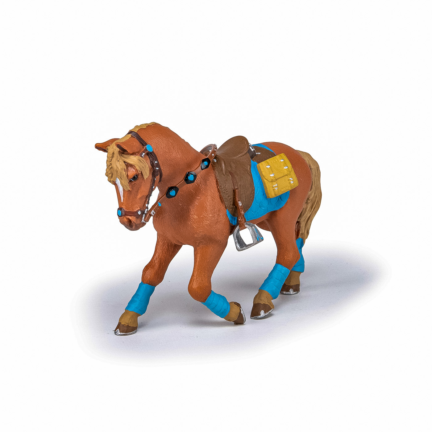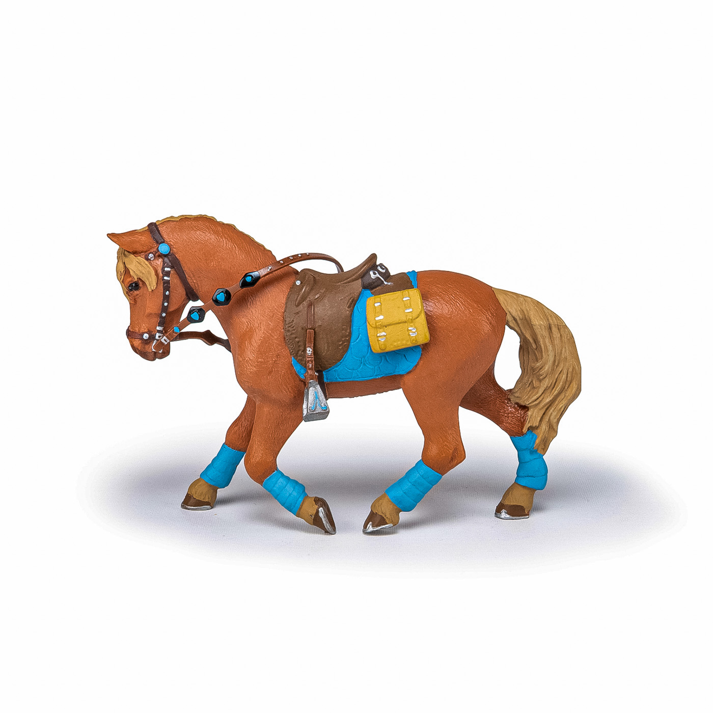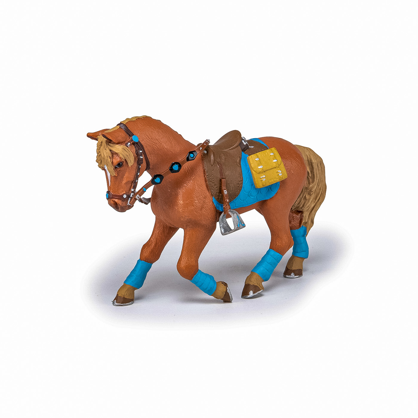 Faceti o plimbare prin campuri cu ecvinele Papo, participati la concursuri de sarituri sau chiar la cursuri de dresaj. Foarte elegant, cu sa albastra si benzile asortate, care ies in evidenta pe blana sa castanie, acest cal asteapta cu rabdare sosirea calaretului sau pentru a merge la o plimbare in padure. Produsul are urmatoarele dimensiuni 11.7 x 3.5 x 8cm si este recomandat copiilor cu varsta peste 3 ani. De mai bine de 20 de ani, Papo inoveaza constant si ii face pe copii din intreaga lume sa viseze cu o gama bogata de peste 600 de produse, reprezentand 12 lumi, animale si personaje. De la modelul original la serie, fiecare dintre figurinele Papo a fost conceputa si creata in Franta pentru a fi fabricata intr-o permanenta preocupare pentru calitate. Pictate manual, atentia la detalii este acum recunoscuta. Figurinele Papo se disting prin acuratete si realism, detaliile sunt de asa natura incat am putea crede ca se vor pune in miscare.