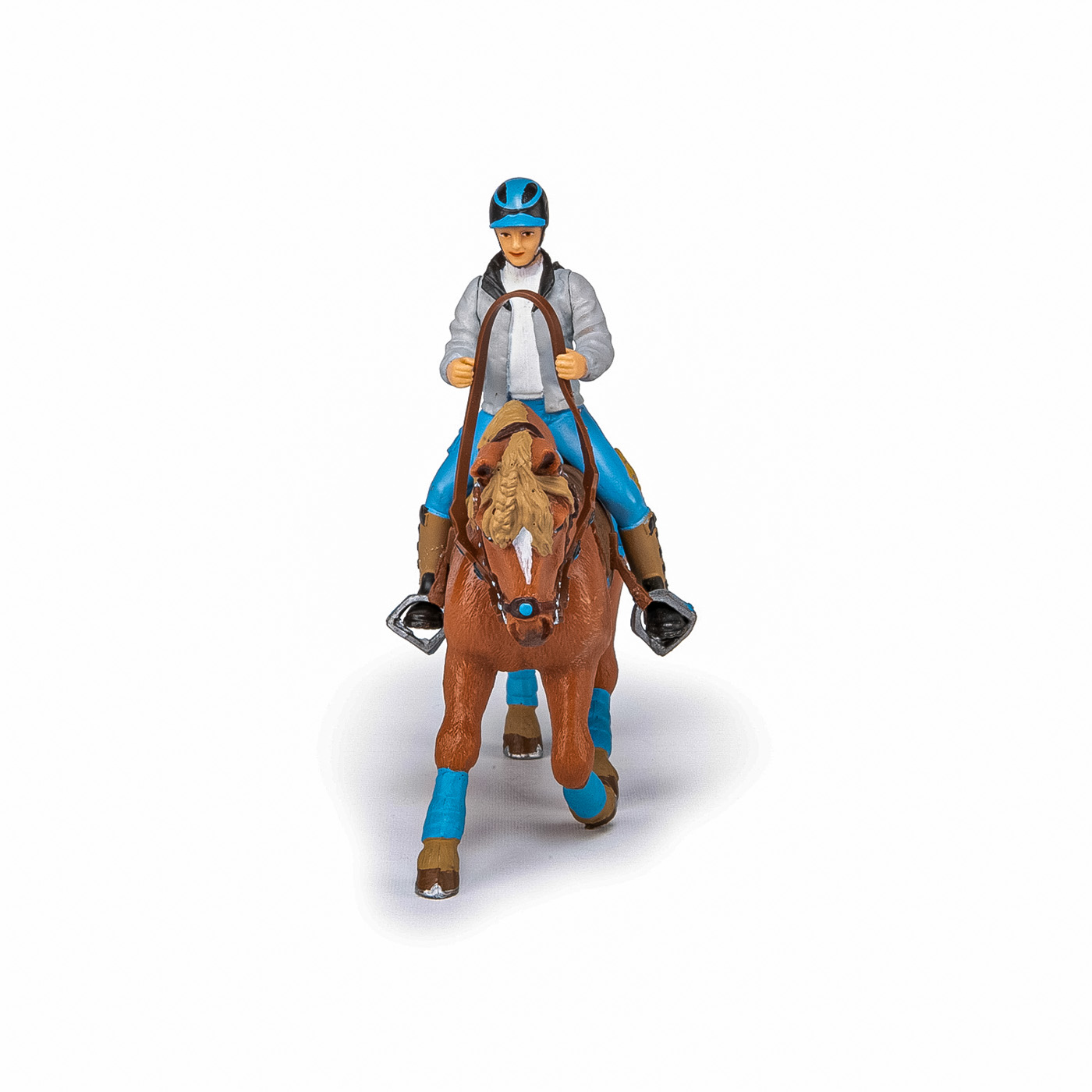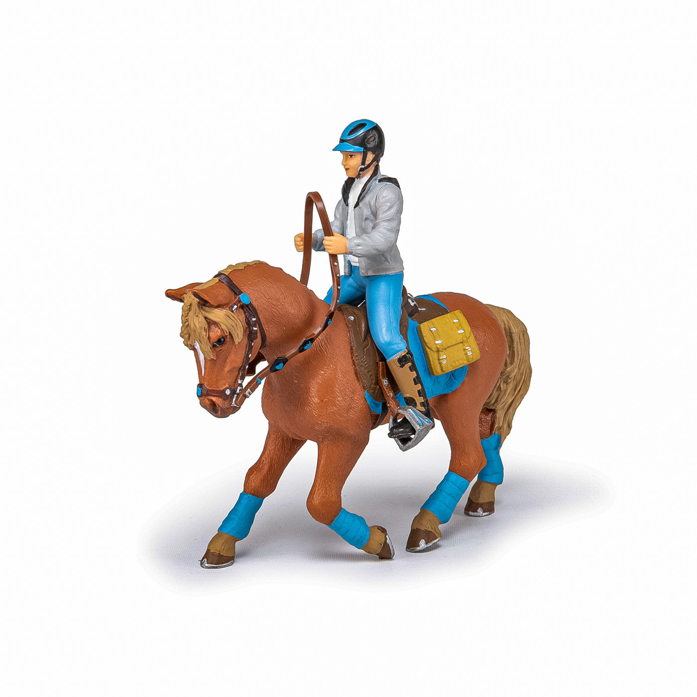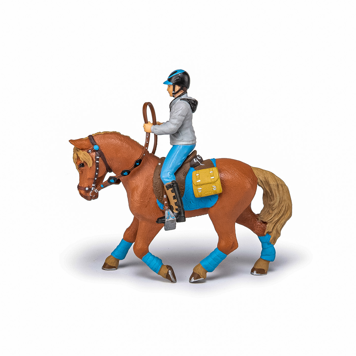 Faceti o plimbare prin campuri cu ecvinele Papo, participati la concursuri de sarituri sau chiar la cursuri de dresaj. Foarte elegant, cu sa albastra si benzile asortate, care ies in evidenta pe blana sa castanie, acest cal asteapta cu rabdare sosirea calaretului sau pentru a merge la o plimbare in padure. Produsul are urmatoarele dimensiuni 11.7 x 3.5 x 8cm si este recomandat copiilor cu varsta peste 3 ani. De mai bine de 20 de ani, Papo inoveaza constant si ii face pe copii din intreaga lume sa viseze cu o gama bogata de peste 600 de produse, reprezentand 12 lumi, animale si personaje. De la modelul original la serie, fiecare dintre figurinele Papo a fost conceputa si creata in Franta pentru a fi fabricata intr-o permanenta preocupare pentru calitate. Pictate manual, atentia la detalii este acum recunoscuta. Figurinele Papo se disting prin acuratete si realism, detaliile sunt de asa natura incat am putea crede ca se vor pune in miscare.