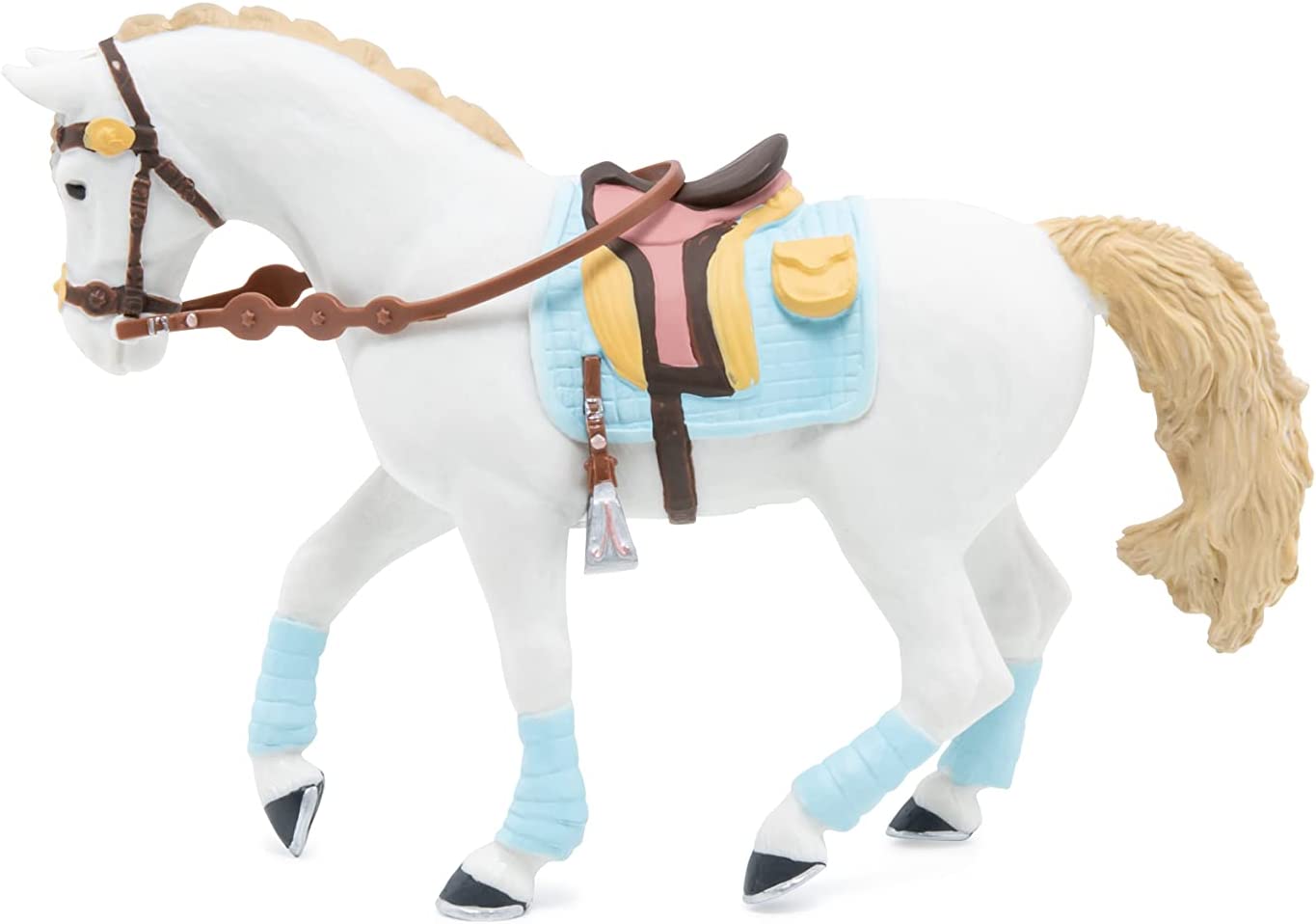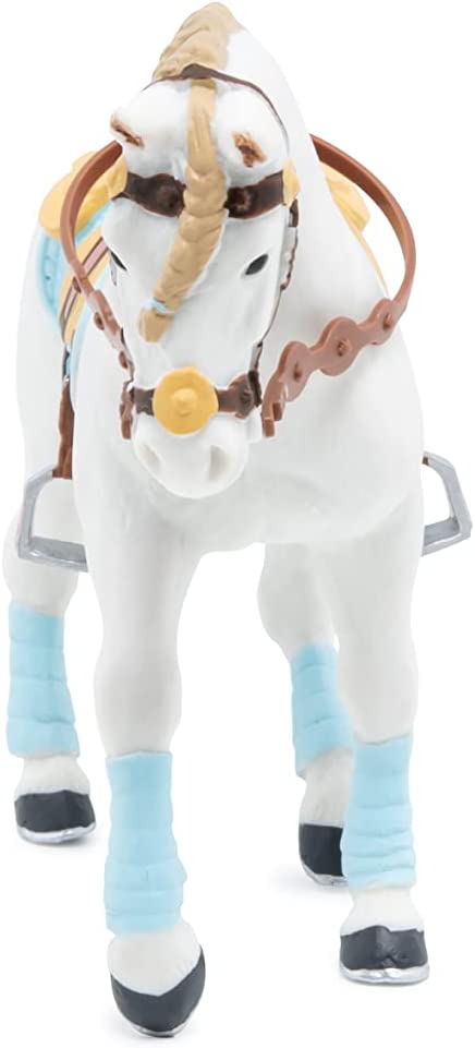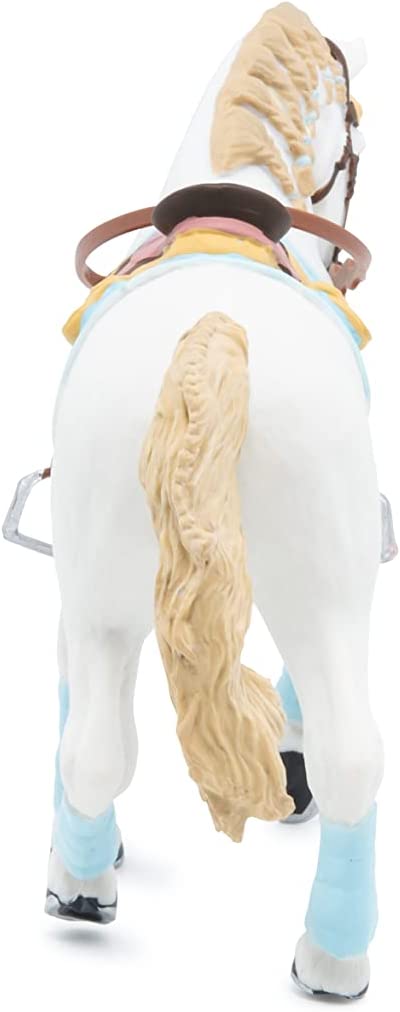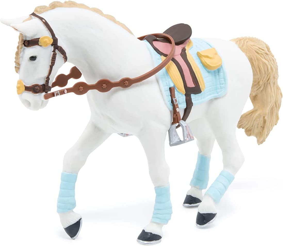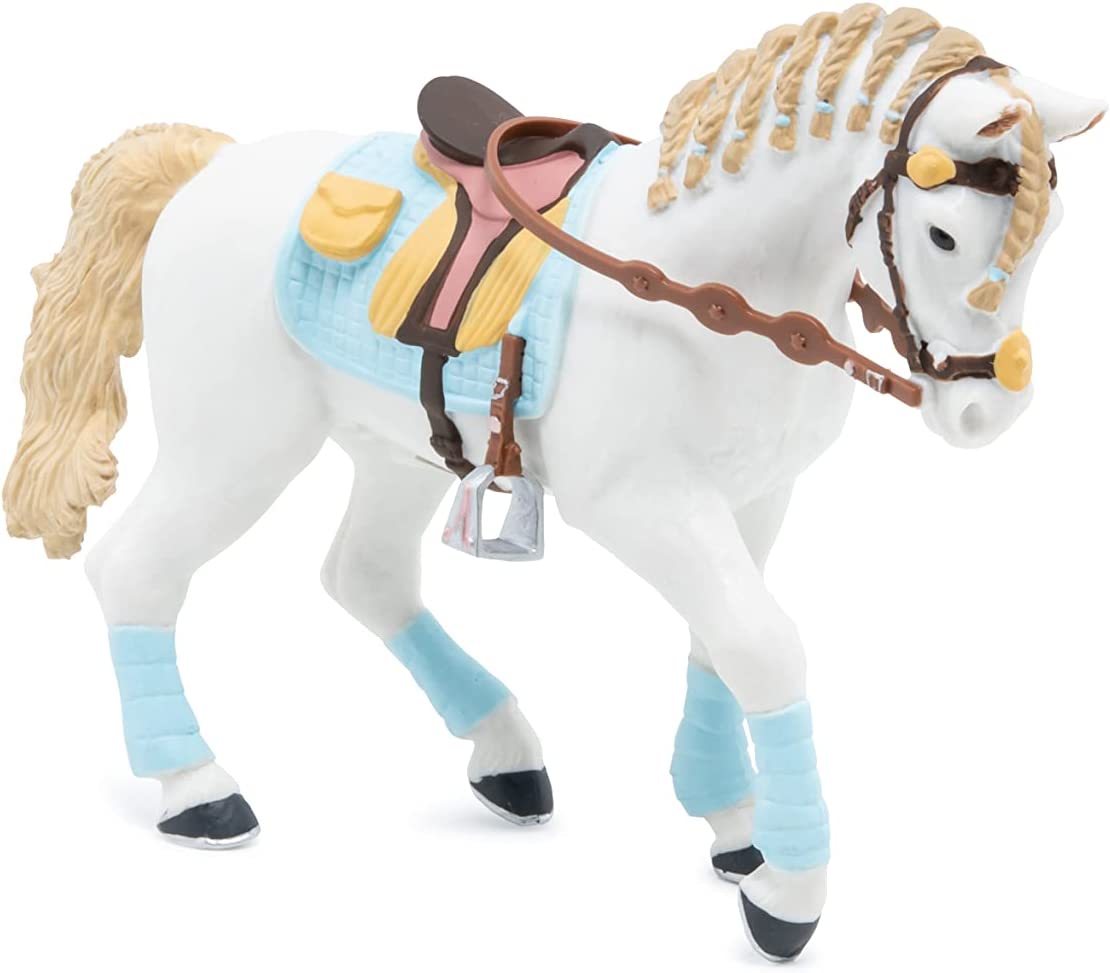Faceti o plimbare prin campuri cu ecvinele Papo, participati la concursuri de sarituri sau chiar la cursuri de dresaj. Calaretul foarte elegant imbracat in albastru si maro si-a pregatit calul in armonie cu tinuta ei. Saua albastra si maro, benzile albastre, coama impletita si benzile mici elastice tot de culoare albastra. Cert este, primul loc al concursului de eleganta este pentru ei! Produsul are urmatoarele dimensiuni 14.5 x 5 x 9.5cm si este recomandat copiilor cu varsta peste 3 ani. De mai bine de 20 de ani, Papo inoveaza constant si ii face pe copii din intreaga lume sa viseze cu o gama bogata de peste 600 de produse, reprezentand 12 lumi, animale si personaje. De la modelul original la serie, fiecare dintre figurinele Papo a fost conceputa si creata in Franta pentru a fi fabricata intr-o permanenta preocupare pentru calitate. Pictate manual, atentia la detalii este acum recunoscuta. Figurinele Papo se disting prin acuratete si realism, detaliile sunt de asa natura incat am putea crede ca se vor pune in miscare.