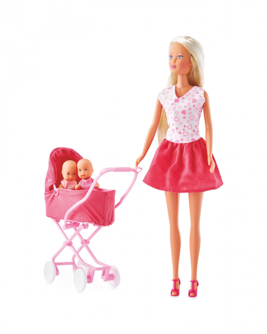 Steffi a iesit la plimbare cu cei doi copilasi. Fiind si o mama responsabila, ea are grija de ei cu ajutorul accesoriilor incluse. Setul contine 2 bebelusi de 5 cm, accesorii pentru joaca si hranirea bebelusilor, 1 carucior, 1 papusa Steffi